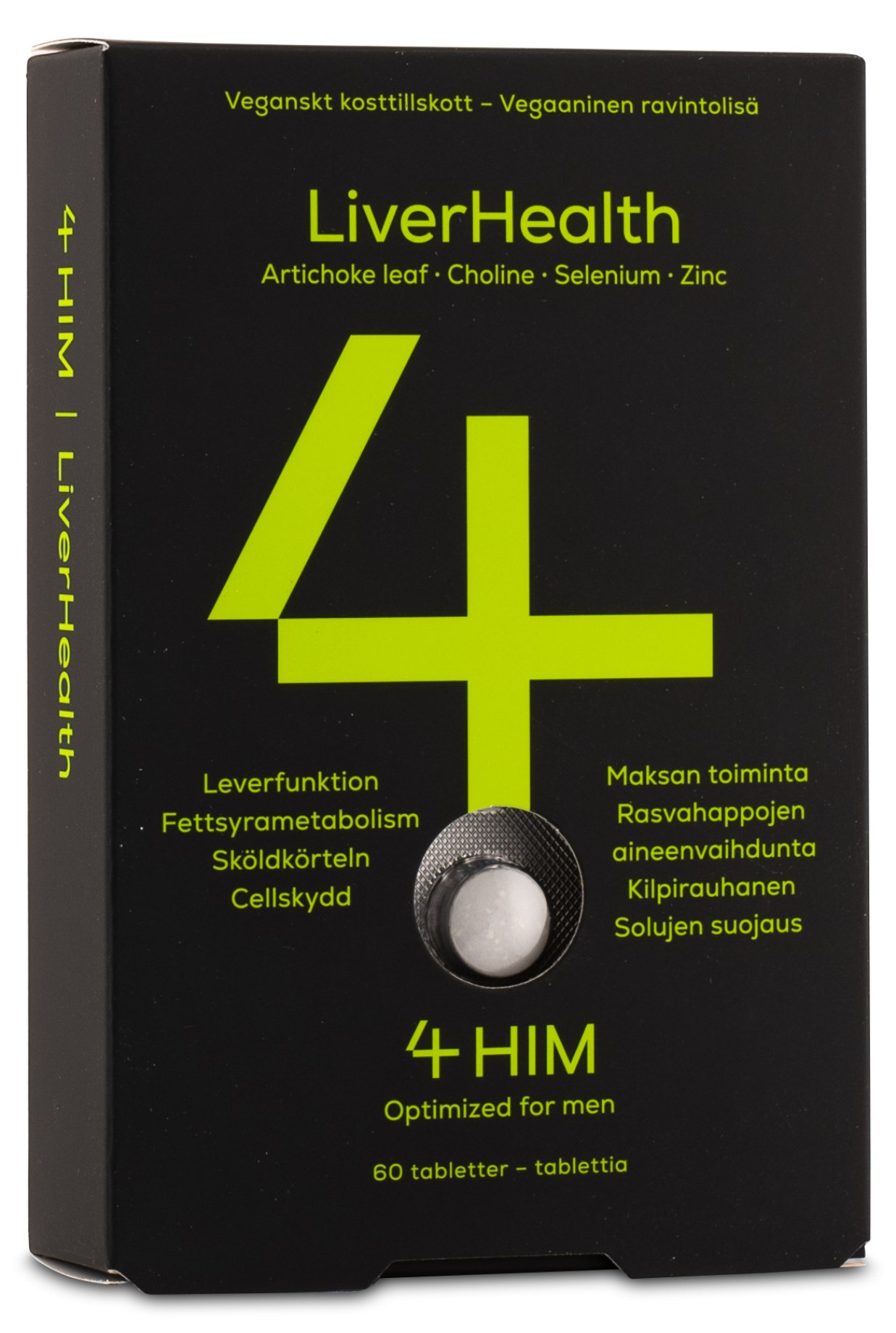 Tue kehoasi 4HIM LiverHealth -ravintolisällä, joka on erityisesti kehitetty miehille. Sisältää koliinia, sinkkiä, seleeniä sekä E-, C- ja B6-vitamiineja ja lisäksi artisokanlehtiuutetta. Koliini tukee normaalia maksan toimintaa ja rasva-aineenvaihduntaa, kun taas sinkki edistää rasvahappojen normaalia aineenvaihduntaa. Sinkki, E- ja C-vitamiini suojaavat soluja oksidatiiviselta stressiltä. B6-vitamiini edistää proteiini- ja glykogeeniaineenvaihduntaa ja seleeni tukee normaalisti kilpirauhasen toimintaa.