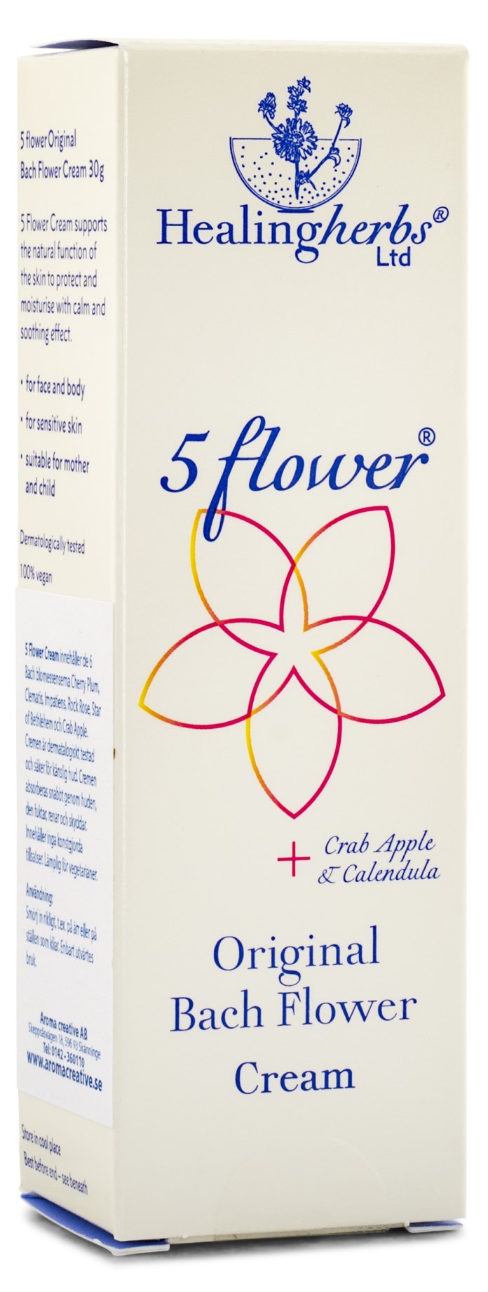 5 flower Cream on puhdistava yleisvoide palovammoille, kutinalle ja muille iho-ongelmille. Voit käyttää sitä hyönteisten puremiin, ihon ärsytykseen ja se auttaa myös arpien paranemisessa. Täydellinen myös talvella kuivien huulten ja aftojen kosteuttamiseen. Voide sisältää kuusi 38 Bach-kukkaisuutetta.