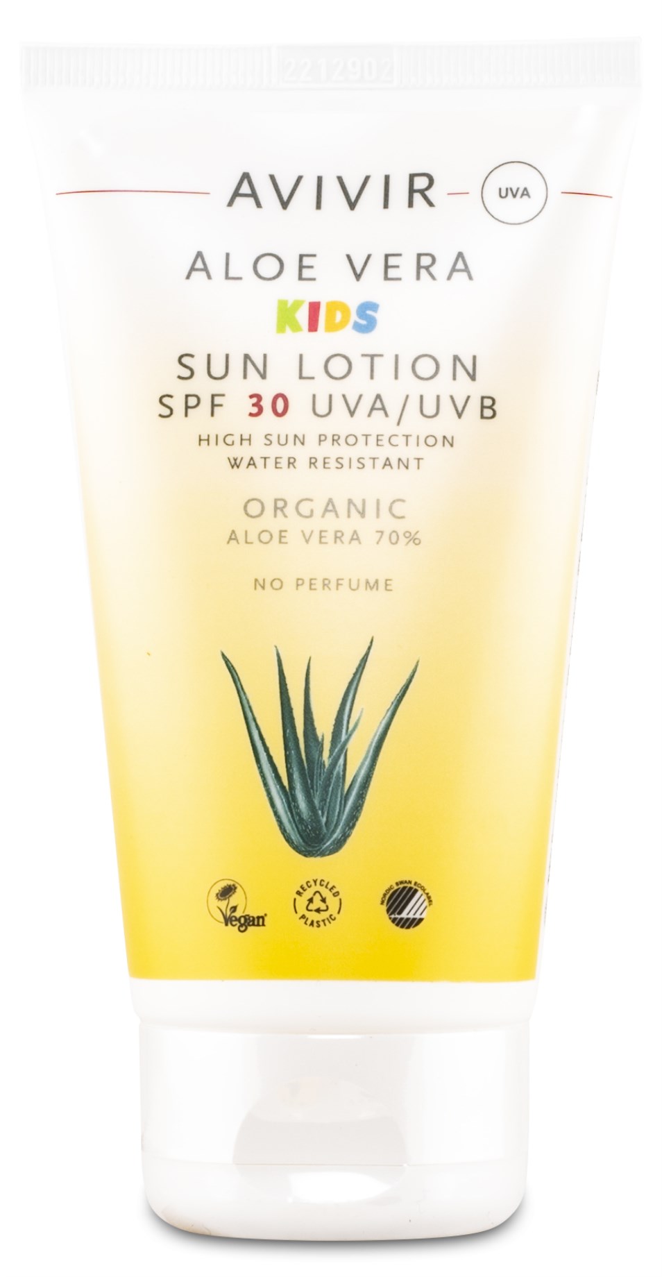 Avivir Aloe Vera Kids Sun Safe 30 on hajusteeton ja vedenkestävä aurinkovoide, jolla on korkea suojakerroin, erityisesti lapsia varten. Aurinkosuojavoide sisältää hoitavia öljyjä ja Bio Active Aloe veraa, jolla on ihoa uudistava vaikutus ja joka vahvistaa sen omaa puolustusta. Se sisältää myös E-vitamiinia, joka vaikuttaa kosteuttavasti ja pehmentävästi iholle.