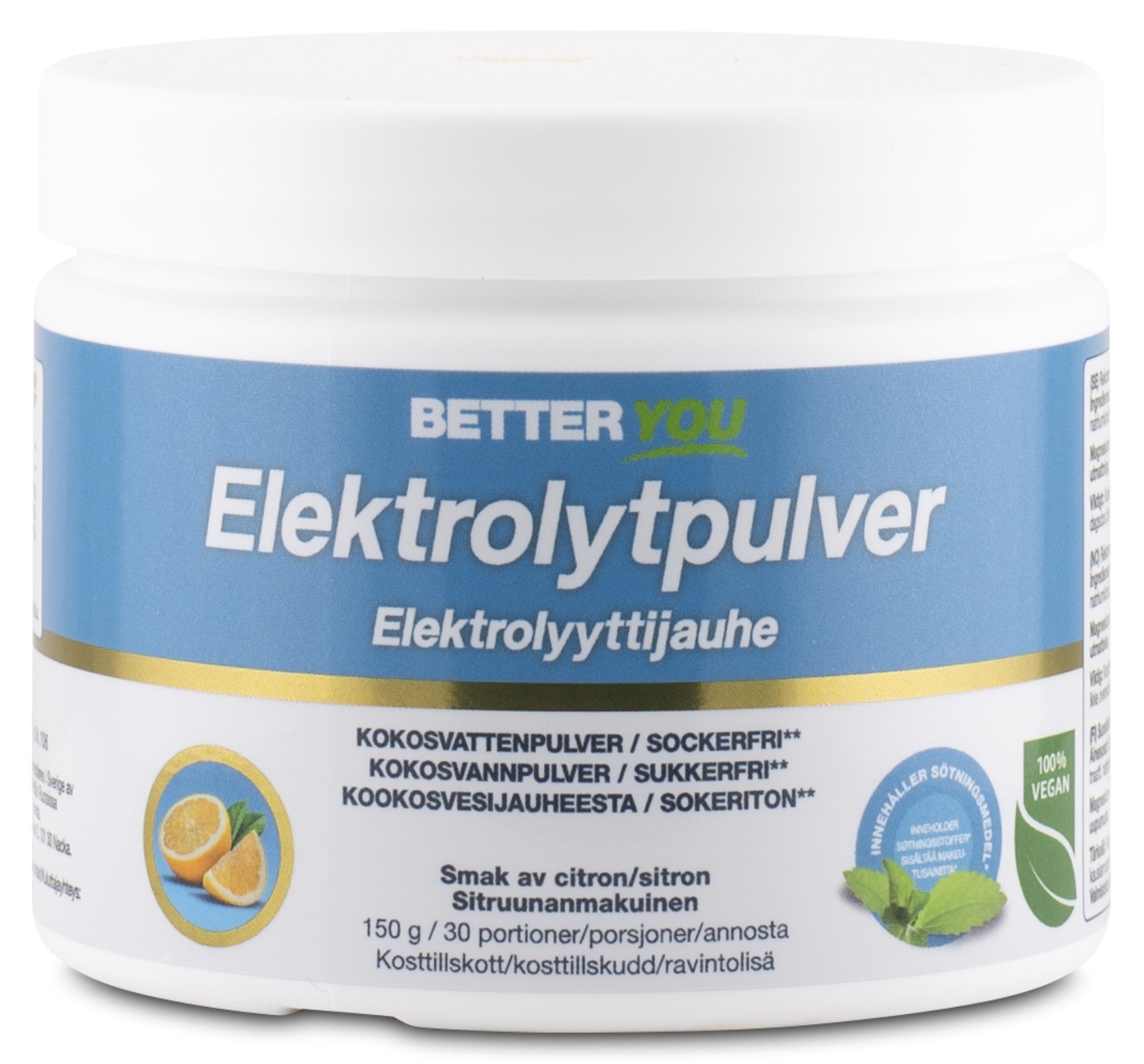 Better You Elektrolyyttijauhe auttaa palauttamaan nestetasapainon, kun olet hikoillut paljon ja menettänyt nestettä. Täydellinen sinulle, joka treenaat ja hikoilet paljon tai sinulla on ongelmia nestetasapainon kanssa. Tärkeimpiä elektrolyyttejä ovat kalsium, kalium ja magnesium. Jotta keho voisi parhaiten imeä elektrolyytit, tuotetta on rikastettu kookosvedellä, joka on runsas elektrolyyteistä. Better You:n elektrolyyttijauhe on täysin vegaaninen.