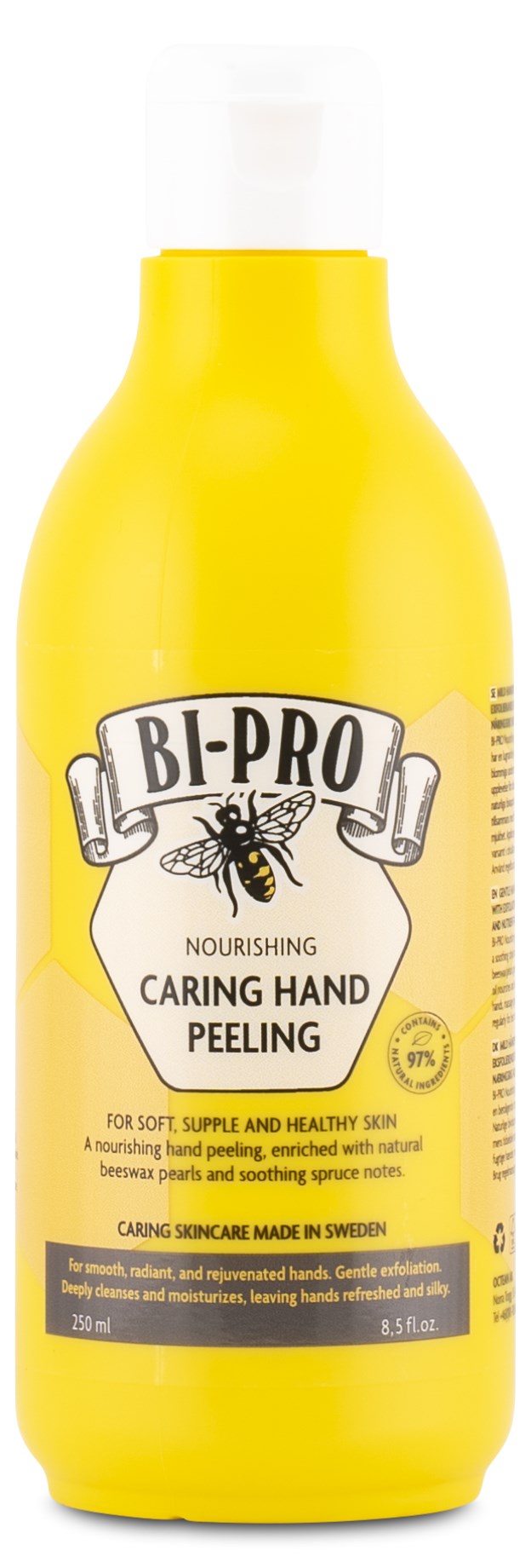 BI-PRO Nourishing Caring Hand Peeling on käsikuorinta, joka huolellisesti kuorii kuolleet ihosolut käsiltäsi. Kuorinta tuoksuu rauhoittavalta ja raikkaalta, ja siinä on sitruksen sekä hienovaraisen kukkaisia vivahteita. Luonnolliset mehiläisvahapallot ja piidioksidi kuorivat hellävaraisesti käsien ihoa silkkisen lopputuloksen saavuttamiseksi. Sisältää muun muassa ohdakeöljyä ja glyseriiniä, jotka kosteuttavat ja ravitsevat ihoa.
