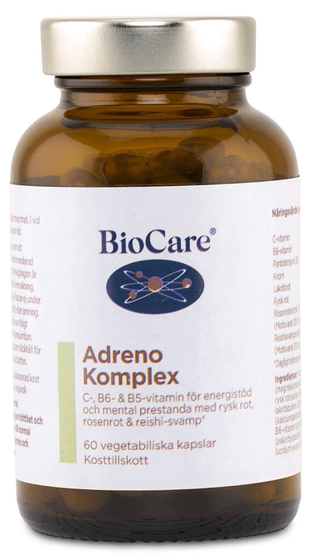 Biocare Adreno Komplex sisältää ainutlaatuisen yhdistelmän tehokkaita ravintoaineita, jotka auttavat tarjoamaan energiaa ja henkistä suorituskykyä. Sisältää muun muassa B5-vitamiinia, B6-vitamiinia, C-vitamiinia, Reishi- sientä ja magnesiumia. Ilman tarpeettomia lisäaineita!