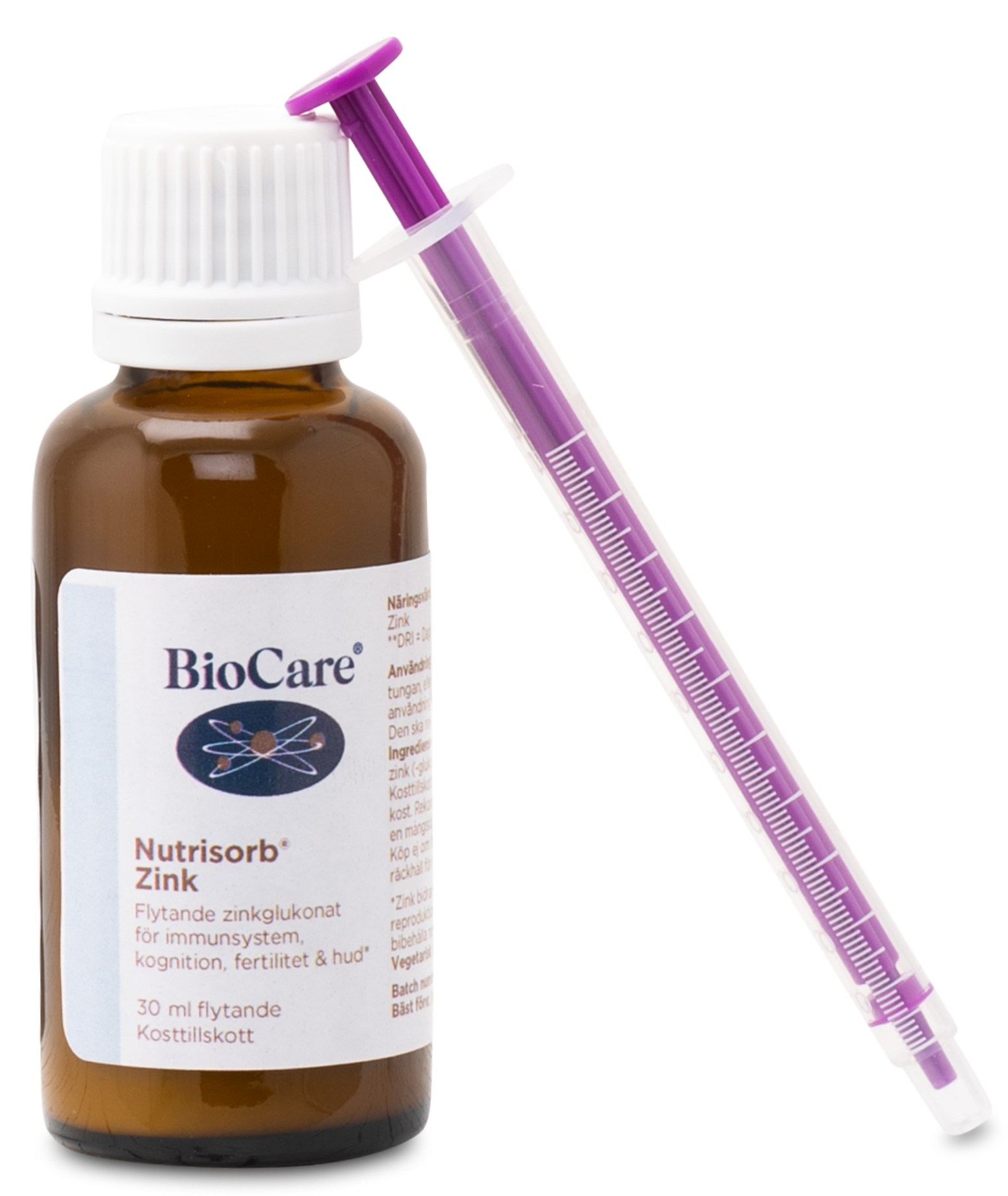 BioCaren Nutrisorb Zinc on vesipohjainen nestemäinen sinkkilisä, joka sekoitetaan helposti nesteeseen tai laitetaan kielen alle. Neste on valkoista ja koostumukseltaan siirappimaista. Vaikka koostumus on paksuhko, on neste tarpeeksi ohutta annosteltavaksi helposti mukana tulevan ruiskun avulla tai tiputettavaksi suoraan kielen alle. Sinkkilisän voi myös halutessaan sekoittaa muuhun nesteeseen. Sinkki muun muassa suojelee oksidatiiviselta stressiltä sekä edistää normaalin immuunijärjestelmän ylläpitämistä, normaalia DNA-synteesiä ja normaalia hedelmällisyyttä. Nutrisorb Zinc ei sisällä tarpeettomia lisäaineita!