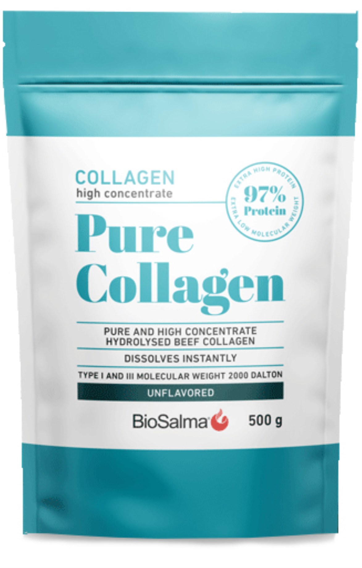 BioSalma Pure Collagen 100% valmistetaan entsymaattisella hydrolyysillä. Tämä menetelmä tuottaa pieniä kollageenipeptidejä (alle 2000 daltonia). BioSalma Pure Collagen 100% -tuotteen proteiinipitoisuus on peräti 91 %, ja se koostuu 85 %:sti tyypin I kollageenista ja 15 %:sti tyypin III kollageenista. Maku on neutraali ja jauhe liukenee nopeasti sekä kylmiin että kuumiin nesteisiin.