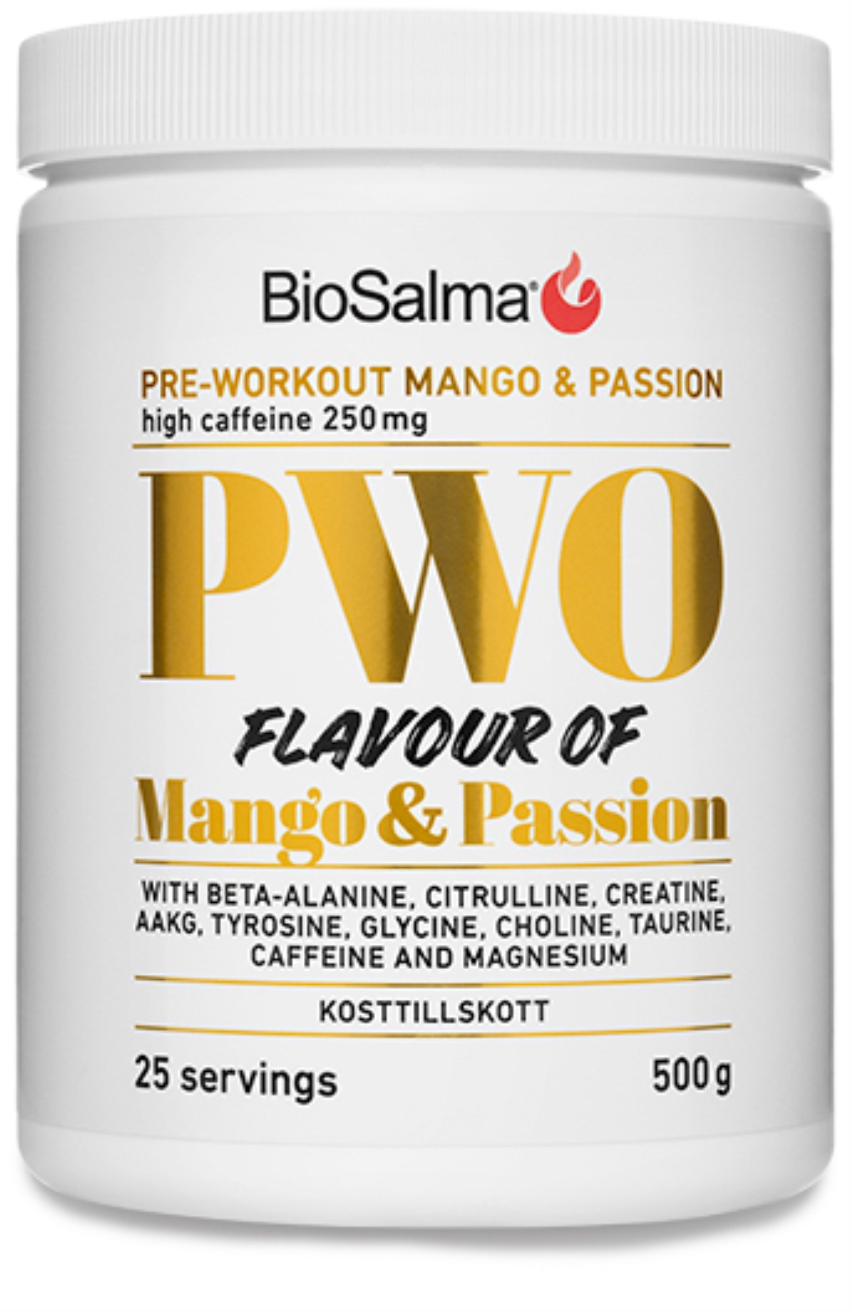 BioSalma PWO on huolellisesti koostettu pre-workout, jossa on reilu annos kofeiinia ja kreatiinia sekä tärkeitä aminohappoja ja elektrolyyttejä. Kreatiinin on osoitettu voivan lisätä fyysistä suorituskykyä lyhytkestoisessa ja korkeatehoisessa harjoittelussa. Magnesium edistää muun muassa normaalia energia-aineenvaihduntaa ja lihasten toimintaa sekä vähentää väsymystä ja uupumusta. Täydellinen silloin, kun tarvitset lisäboostin ennen treeniä!