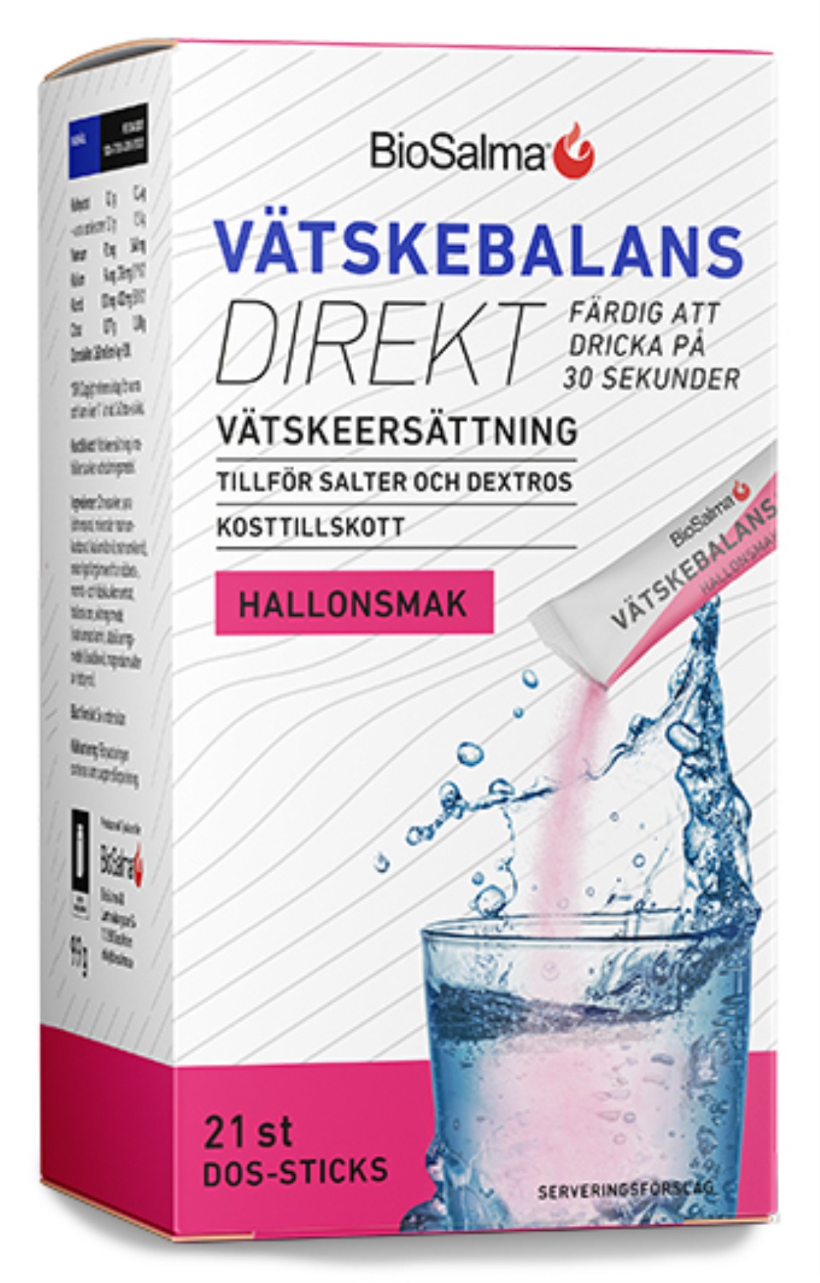 BioSalma® Vätskebalans Direkt on nestetasapainoa tukeva nesteytysvalmiste, joka auttaa täydentämään sekä nestettä että suoloja. Se on pakattu käteviin annospusseihin. Jauhe liukenee veteen nopeasti, noin 30 sekunnissa, joten saat tarvittaessa nesteytyksen helposti ja nopeasti. Saatavana vadelman ja sitruunan makuisena.