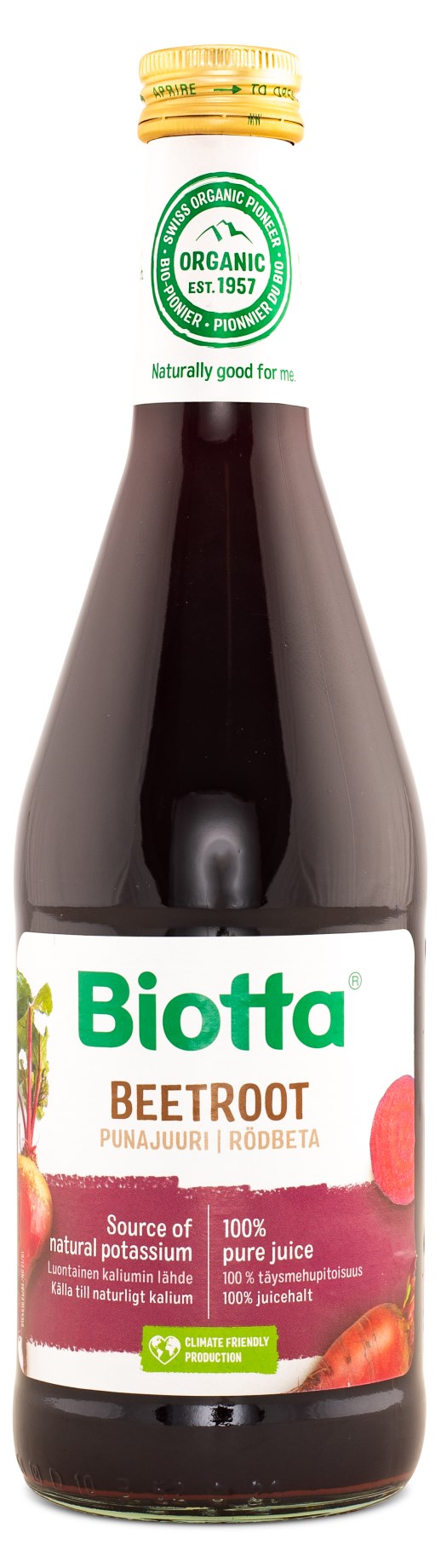 Punajuurimehu ei ole vain herkullista, vaan myös täynnä hyötyjä! Punajuuri on antioksidanttien lähde ja siinä on runsaasti B9-vitamiinia eli foolihappoa. Lisäksi punajuurella on poikkeuksellisen korkea nitraattipitoisuus, jolla on useita suotuisia ominaisuuksia. Nitraatti nimittäin edistää kehon tuotantoa typen oksidista, aineesta joka auttaa laajentamaan verisuonia ja lisäämään verenkiertoa. Tämä puolestaan auttaa ylläpitämään verenpainetta normaalilla tasolla.