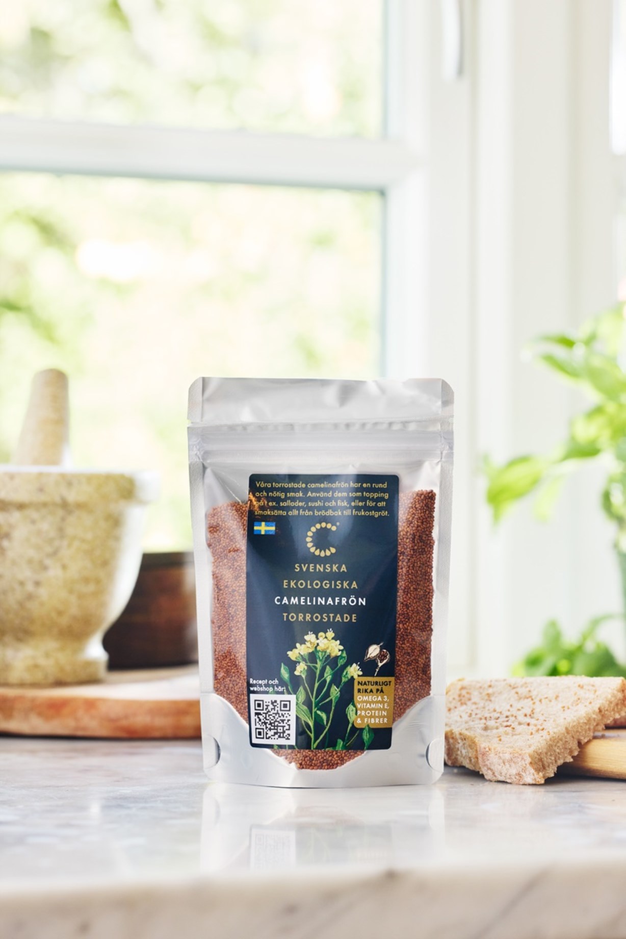 Kuivapaahdetut camelina-siemenet ovat ravinteikkaita, pieniä ja terrakotanruskeita, joissa on pähkinäinen maku ja ihanan rapea koostumus. Ne ovat KRAV-sertifioituja ja huolellisesti paahdettu perhetilalla Södermanlandissa Ruotsissa – tuotettu huolella sekä terveyttäsi että ympäristöä ajatellen. Ne sisältävät terveellisiä rasvahappoja ja ovat lisäksi luonnostaan runsaita proteiinin ja kuidun lähteitä. Erinomainen vaihtoehto chia-, seesam- ja unikonsiemenille tai pähkinöille. Camelina-siemenet ovat monikäyttöisiä ja soveltuvat keittiössä esimerkiksi salaatin, sushin ja kalan päälle tai maustajaksi leivontaan ja puuroon.
