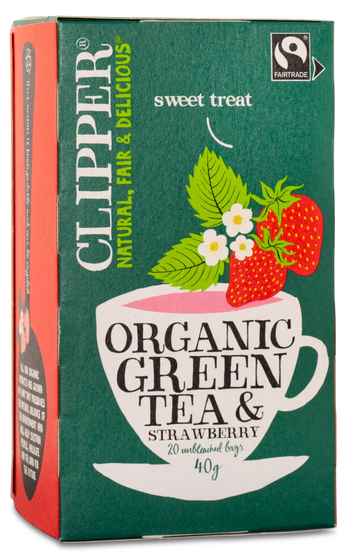 Clipper Tea Green Tea & Strawberry on virkistävä vihreä tee, jossa on mansikan maku. Tämä vaalea tee sisältää lisättyjä mansikkapaloja, jotka antavat luonnollisen ja herkullisen maun. Vihreällä teellä on antioksidanttisia ominaisuuksia ja se edistää myös ruoansulatusta. Nautiskele kuppi ekologista ja Reilun kaupan Clipper Tea Green Tea & Strawberry -teetä päivän aikana tai kun kaipaat jotain lämmintä ja luonnollisesti makeaa.