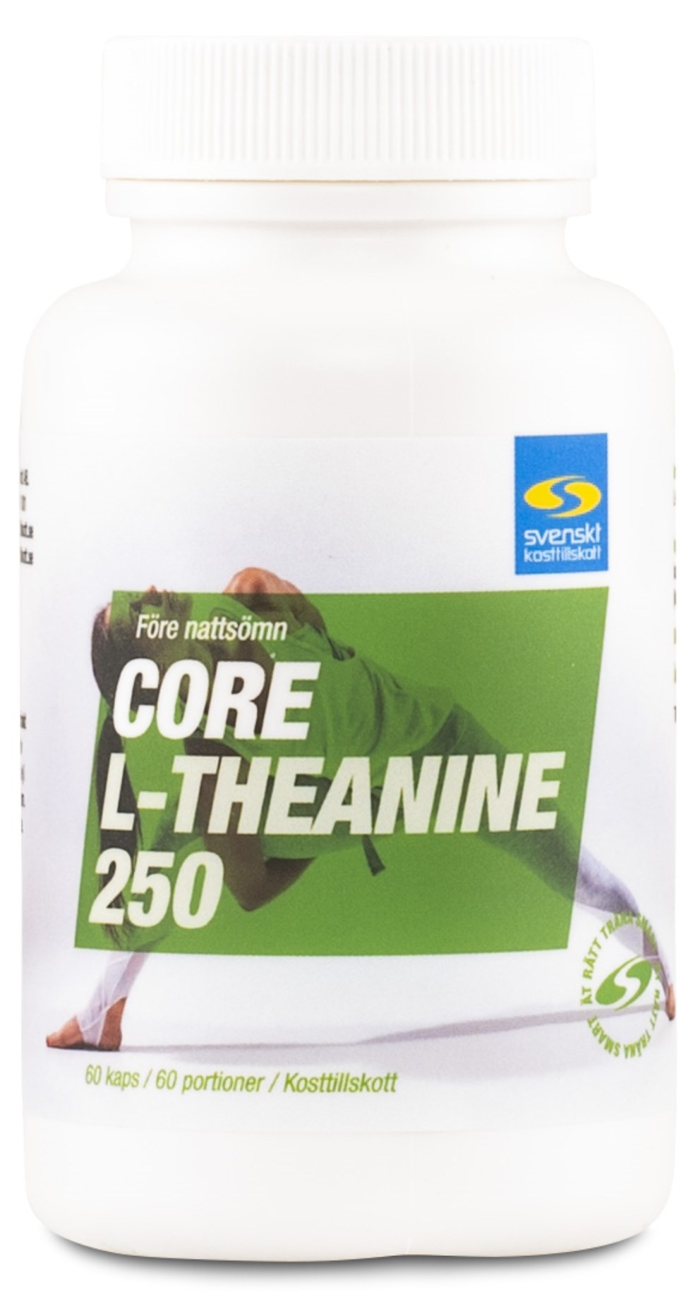 Core L-teaniini 250 on lisäravinne, joka sisältää 250 mg aminohappoa L-teaniinia tiivistetyssä muodossa. Kapseleiden nauttimista suositellaan ennen nukkumaanmenoa edistämään rentoutumista ja palautumista unen aikana. L-teaniini on aminohappo, jota esiintyy luonnollisesti vihreässä teessä ja joka on osoittanut mielenkiintoisia tuloksia useissa tutkimuksissa (1,2).