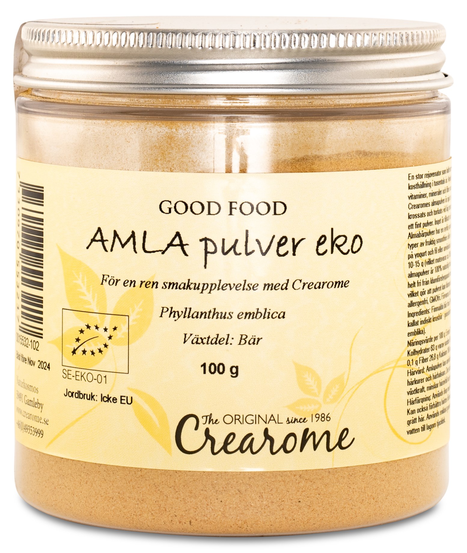 Crearome Amla-jauhe, Luomu on puhdasta jauhettua marjaa, ilman lisäaineita tai lisättyä sokeria. Amlahedelmää (Phyllanthus emblica) kutsutaan myös intialaiseksi karviainenksi, gooseberryksi ja emblikakukkasbuskiksi. Amla on tärkeä osa tuhansia vuosia vanhaa Ayurveda-ruokavaliota. Amla on luonnollisesti ravinto- ja kuiturikas ja vain 10 grammaa jauhetta vastaa melkein 100 grammaa tuoreita marjoja. Amlalla on hyvä hapan maku, ja se sopii smoothieihin, jogurttiin tai hapokkaisiin jälkiruokiin. Crearome Amla -jauhe on 100 % luonnollista, ekologisesti viljeltyjen marjojen rikasta jauhetta.