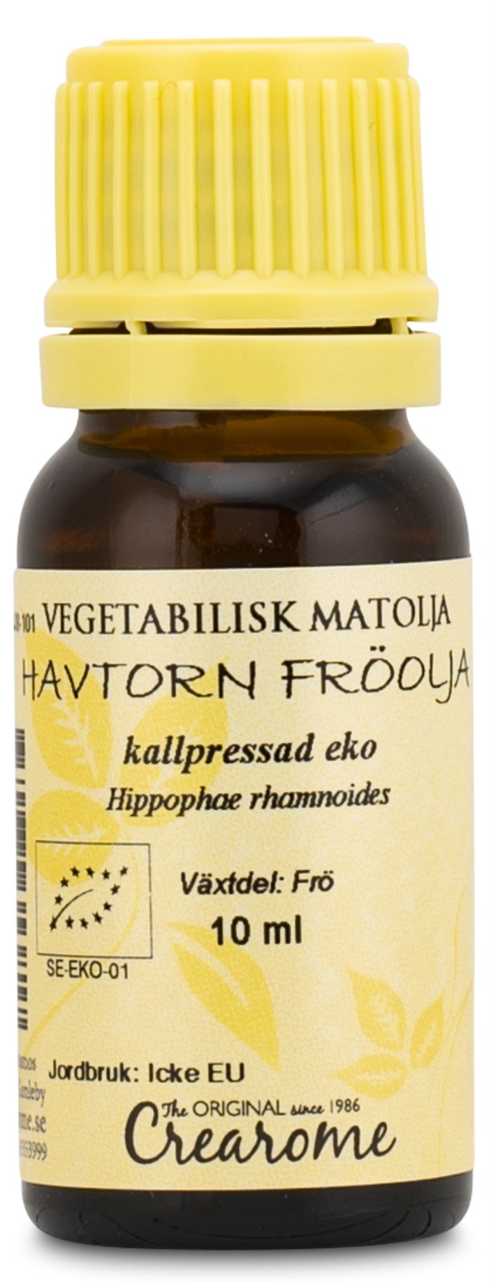 Crearome Kylmäpuristettu Tyrninsiemenöljy sisältää kylmäpuristettua, luomulaatuista tyrniöljyä siemenistä. Tyrniöljy sopii hyvin herkälle tai ärtyneelle iholle runsaan rasvahappopitoisuutensa ansiosta, erityisesti omega-7:n. Omega-7 edistää ihon ja limakalvojen normaalia tilaa.