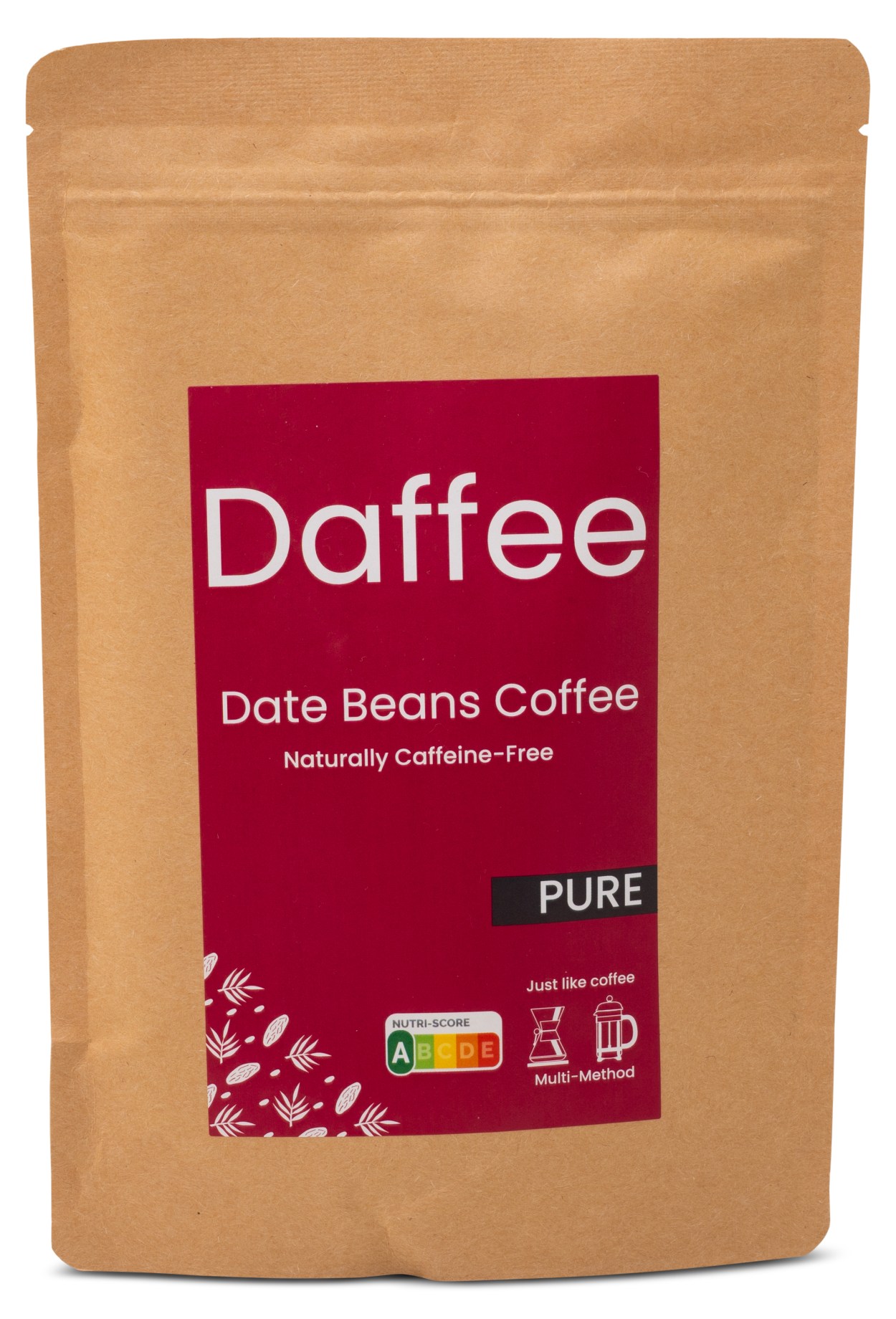 Daffeen Kofeiiniton Taatelikahvi on täysin kofeiiniton kahvi, joka on valmistettu paahdetuista ja jauhetuista luomu taatelinsiemenistä. Taateleista valmistettu kahvi tarjoaa runsaan ja aromaattisen maun, ja se valmistetaan samalla tavalla kuin tavallinen kahvi. Dadelkaffe on lisäksi luonnostaan rikas antioksidanttien, raudan, kuitujen ja tärkeiden mineraalien lähde. Koska kahvi on kofeiiniton, sinun ei tarvitse huolehtia unettomuudesta, vaan voit nauttia maukkaan kupillisen milloin tahansa.