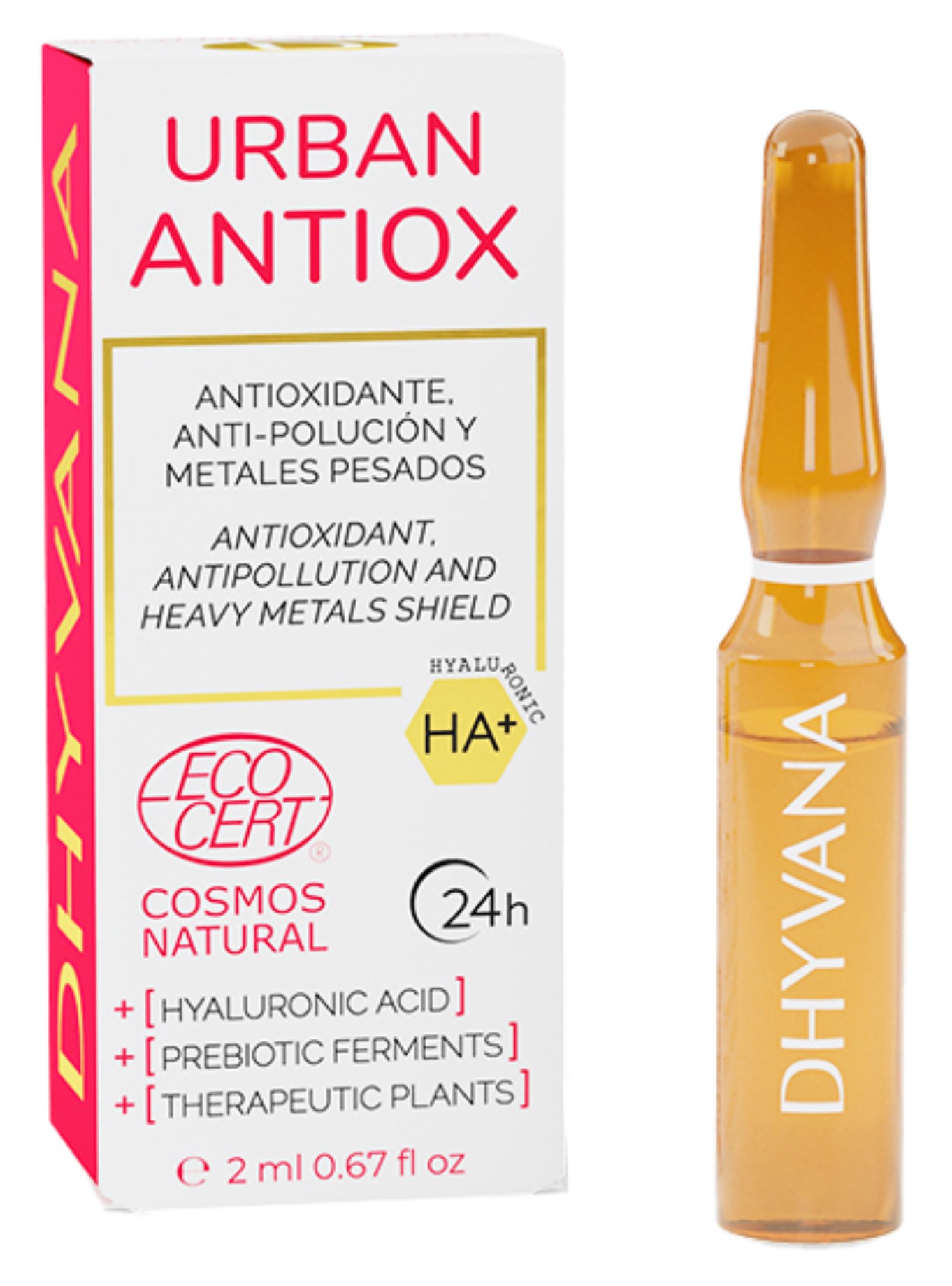 Dhyvana Ampuller URBAN ANTIOX on hyaluronihappo-ampulli, jossa on antioksidanttisia ominaisuuksia - täydellinen sinulle, jonka ihoa on rasitettu ja joka on altistunut saasteille! Mukana prebioottista Piachia, Draco-uutetta, sekä hoitavia uutteita jääsalaatin lehdistä, vesiäkämmenestä (Bacopa), moringasta ja lapsanasta. Hyaluronihappo hoitaa ihoa ja suojaa saasteilta. Käytä tehokuurina tai päivittäin pitkäkestoisempien tulosten saavuttamiseksi!