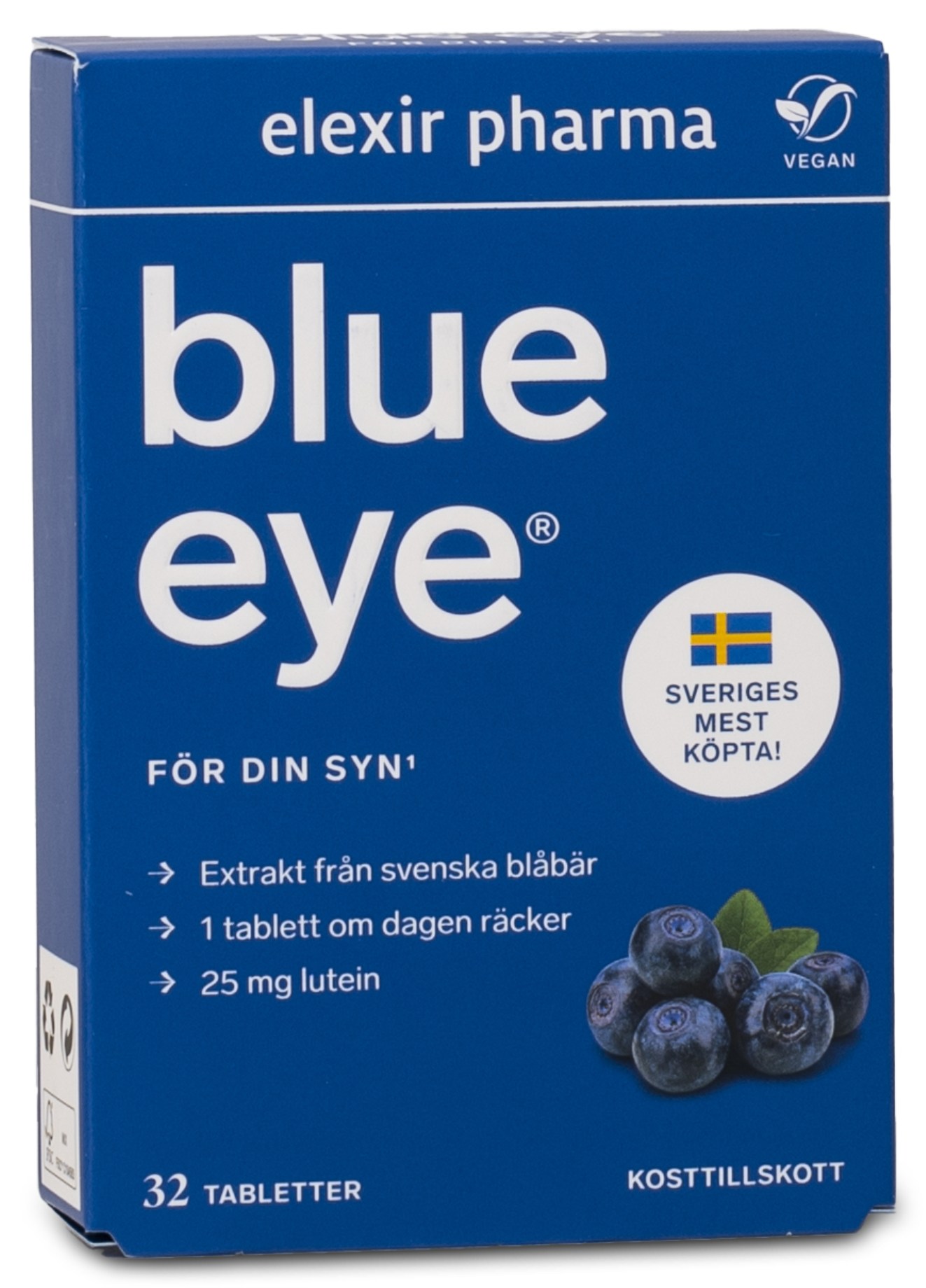 Elexir Pharma Blue Eye -tabletit sisältävät mustikkauutetta, joka on luontainen luteiinin lähde. Luteiinia löytyy muun muassa silmän verkkokalvosta, mutta silmät eivät voi tuottaa luteiinia itse, vaan sitä on saatava ruokavaliosta. Tuotteeseen on lisätty myös kehäkukasta peräisin olevaa luteiinia, joten yksi tabletti sisältää runsaasti luteiinia. Blue Eye sopii päivittäiseksi ravintolisäksi kaikille, jotka haluavat varmistaa näiden ravintoaineiden riittävän saannin ja sitä suositellaan erityisesti yli 50-vuotiaille. Suositeltu annos on yksi tabletti päivässä.