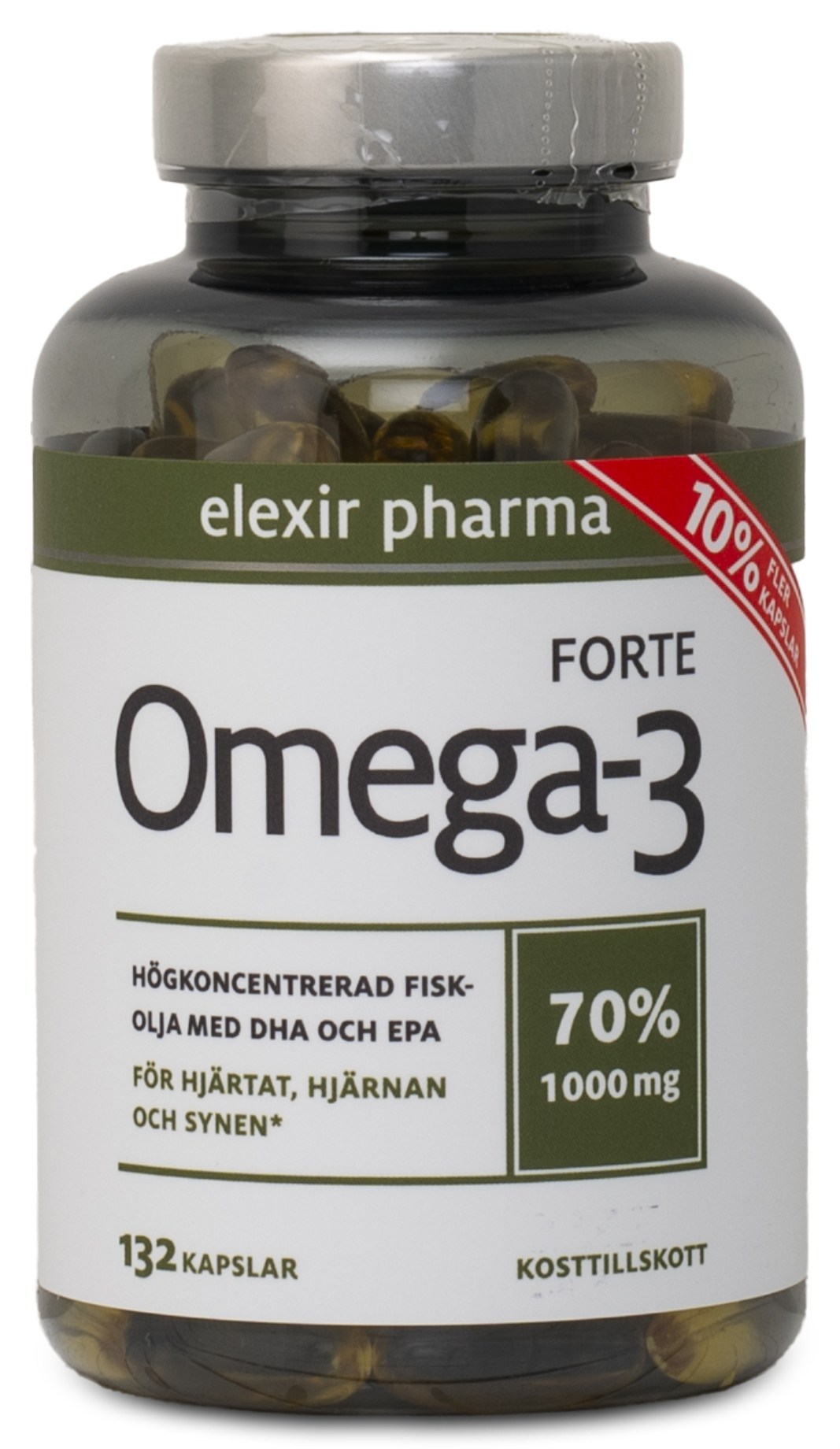 Elexir Pharman Omega-3 Forte antaa kehollesi peräti 70 % omega-3-rasvahappoja per kapseli. Kalanöljy koostuu luonnollisesta kalanöljytiivisteestä ja sisältää runsaasti tärkeitä omega-3-rasvahappoja EPA:ta ja DHA:ta triglyseridimuodossa. Molemmat näistä rasvahapoista ovat tärkeitä sydämen normaalille toiminnalle ja DHA edistää lisäksi normaalia aivotoimintaa ja näköä. Elexir Pharma Omega-3 Forten avulla tarvitset vain yhden kapselin päivässä täyttämään päivittäisen tarpeesi näille terveellisille rasvahapoille.