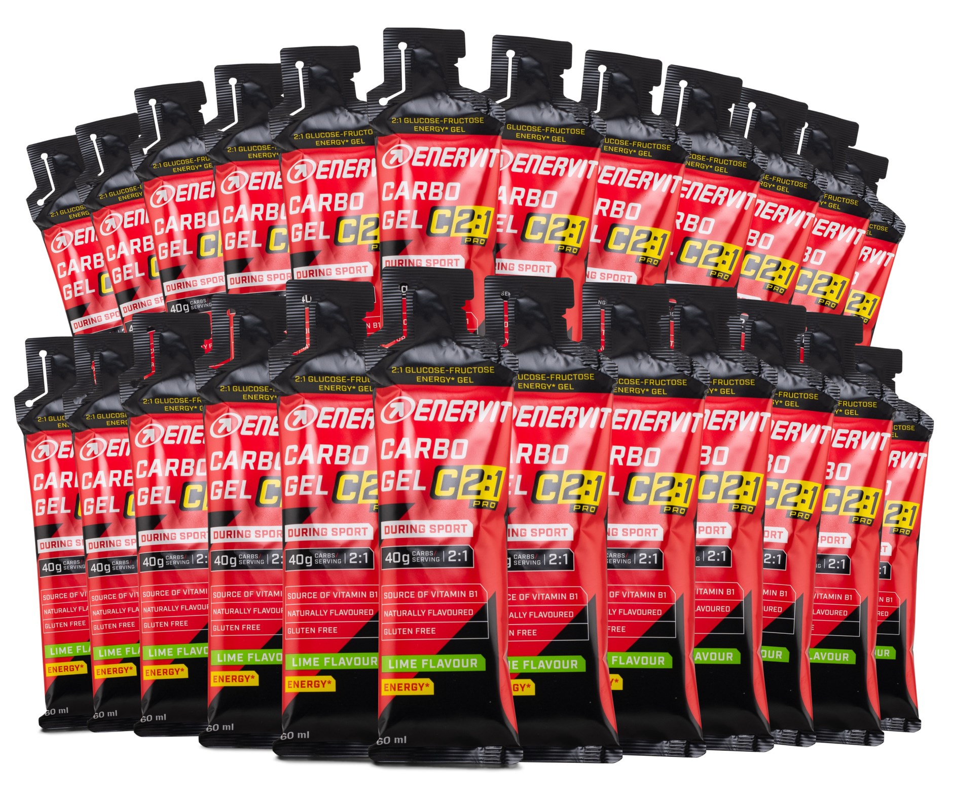 Enervit C2:1 Carbo Gel antaa sinulle kunnon energiaboostin glukoosista, fruktoosista ja hiilihydraateista. Ilman rasvaa ja proteiinia. Suhteella 2:1 glukoosia ja fruktoosia sekä 40 grammaa hiilihydraatteja per annos. Täydellinen mukaan otettavaksi pidemmän treenin aikana. Voit ottaa 1-2 pakkausta geeliä jokaista aktiivista tuntia kohden.