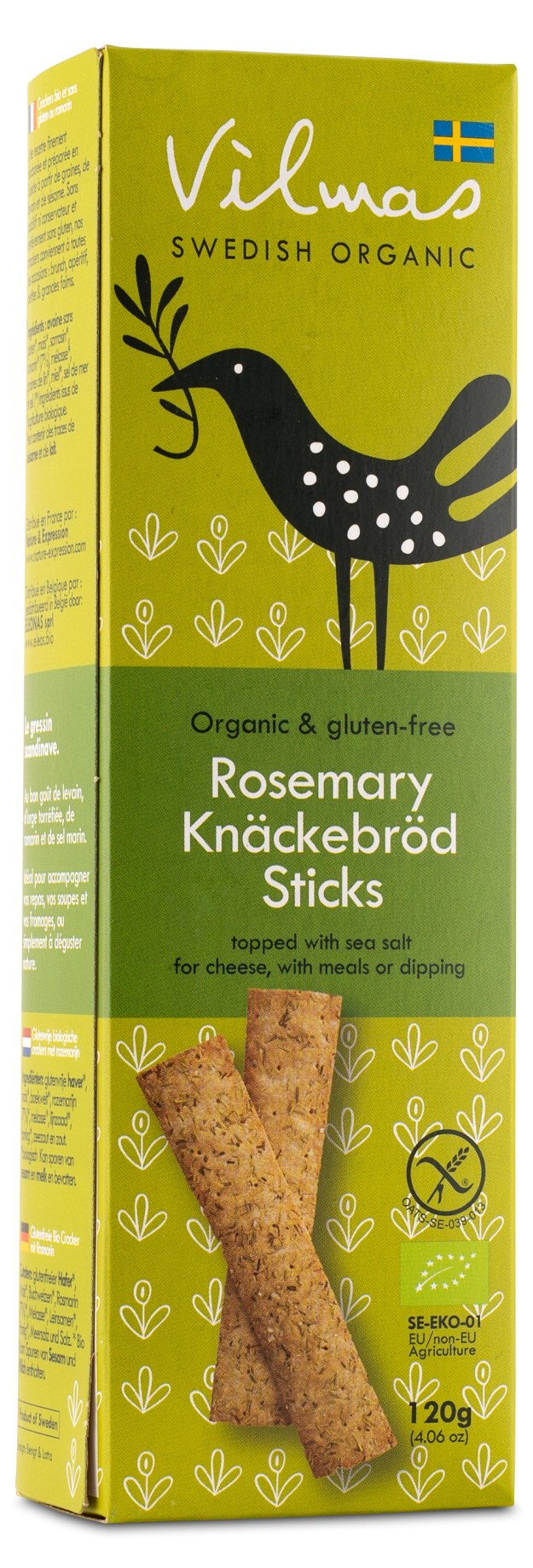 Vilmas Knäckesticks Fjällbergets-leipomolta on Ruotsissa valmistettuja, gluteenittomia ja ekologisia näkkileipiä. Ne on valmistettu Vilmasin omasta juuresta ja leivottu Hoforsissa. Rapeat näkkileivät ovat saatavilla useissa makuvaihtoehdoissa ja ne on päällystetty seesaminsiemenillä ja merisuolalla. Yksinkertaisen ja luonnollisen ainesosaluettelonsa ansiosta ne ovat maukas vaihtoehto sinulle, joka etsit hyvää välipalaa, tai miksei myös lisukkeeksi herkullisille juustoille?