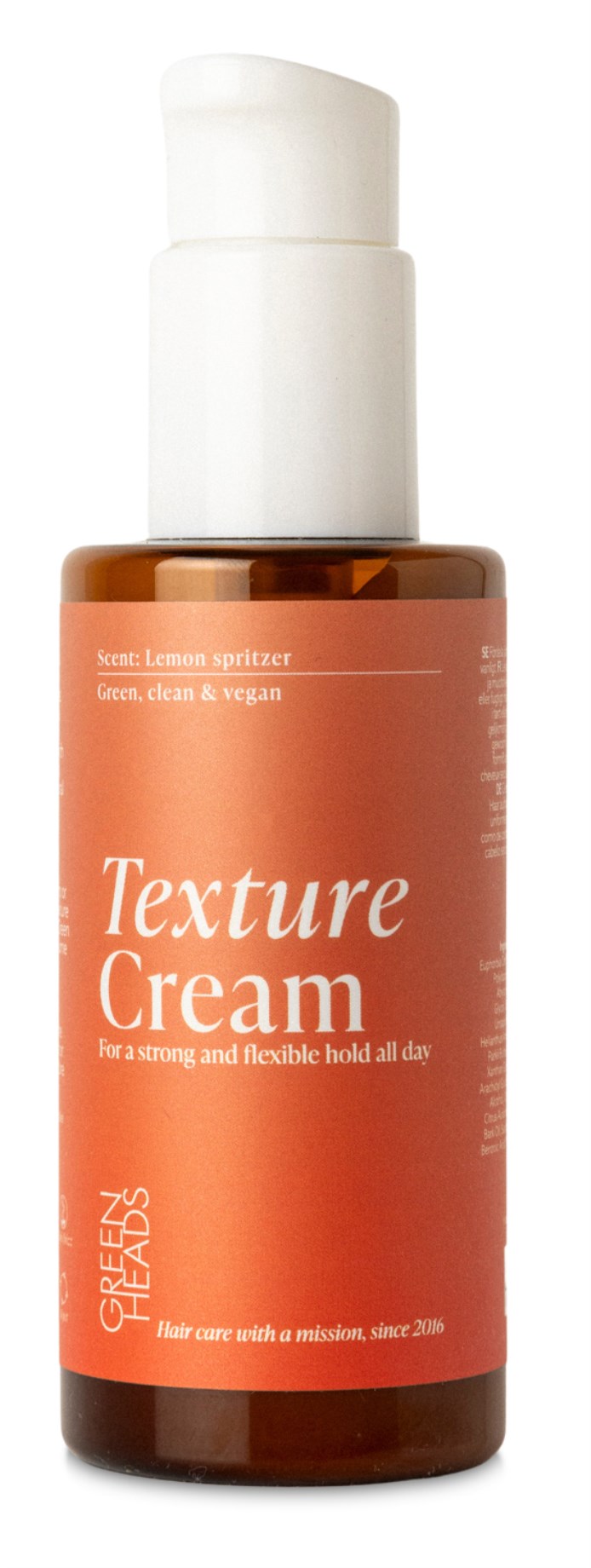 Texture Cream Green Headsilta on ravitseva, ainutlaatuinen muotoiluvoide, joka on suunniteltu luomaan rakennetta, yksityiskohtia ja kiinnitystä hiuksiin. Texture Cream ehkäisee pörröisyyttä ja antaa puolimatan pinnan kaikille hiustyypeille - ohuista paksuihin hiuksiin. Se sopii erityisen hyvin lyhyille hiuksille tai kun haluat korostaa tiettyjä osia luomalla tekstuuria. Sisältää bentoniittisavea kiinnitykseen, kiiltoon ja pörröisyyden vähentämiseen. Aloe vera kosteuttaa ja suojaa hiuksia. Parsakaalinsiemenöljy tuo kiiltoa samalla kun antaa kevyen lämpösuojan ja ehkäisee pörröisyyttä. Lemon Spritzer -tuoksu parantaa kokemusta. Texture Cream on kehitetty terveys ja ympäristö huomioiden ja on sertifioitu PETA:n ja Grön Salongin toimesta.