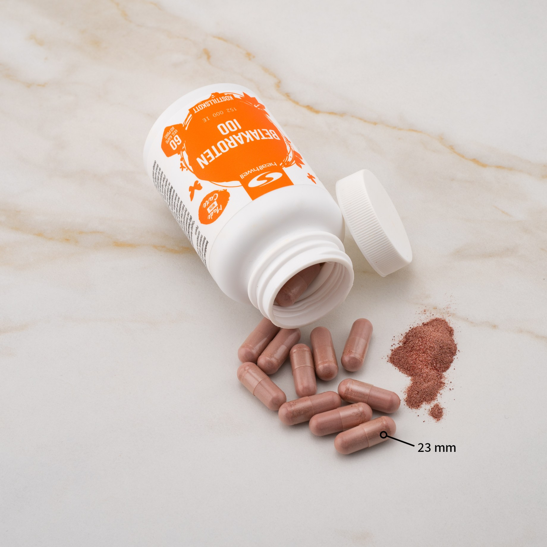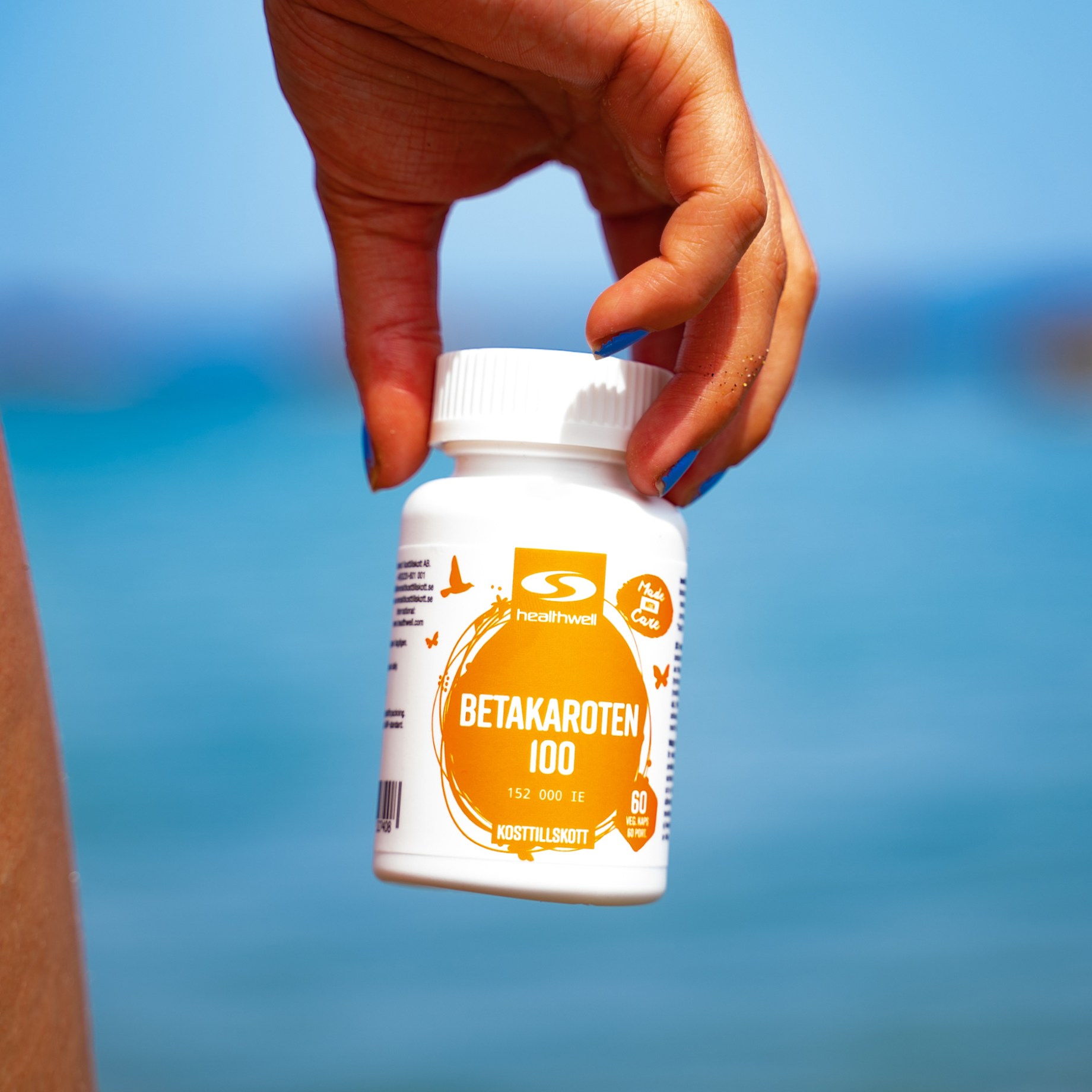 Healthwell Beetakaroteeni 100 on erittäin vahva, luonnollisesta lähteestä saatava beetakaroteenilisä kasviperäisissä kapseleissa. Yksi kapseli sisältää 100 mg beetakaroteenia, mikä vastaa 152 000 IU A-vitamiinia. Beetakaroteeni varastoituu ihon alle ja muuttuu A-vitamiiniksi ihon sitä tarvitessa. Healthwell Beetakaroteeni 100 sisältää lisäksi MCT-kookosöljyä ja mustapippuriuutetta, mikä takaa beetakaroteenin optimaalisen imeytymisen.