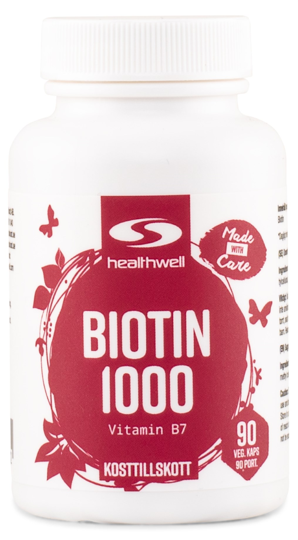 Healthwell Biotiini 1000 sisältää 1000 mikrogrammaa laadukasta biotiinia (B7-vitamiinia) kapselia kohti. Lisäravinne on erinomainen valinta, kun haluat varmistaa B7-vitamiinin riittävän saannin. Biotiini on vesiliukoinen vitamiini, jolla on monia tärkeitä tehtäviä kehossa. Se muun muassa tukee hermoston toimintaa ja edistää normaalia energia-aineenvaihduntaa. Biotiini toimii myös hiusten ja ihon ravinteena ja se tunnetaankin todellisena kauneuden vitamiinina.
