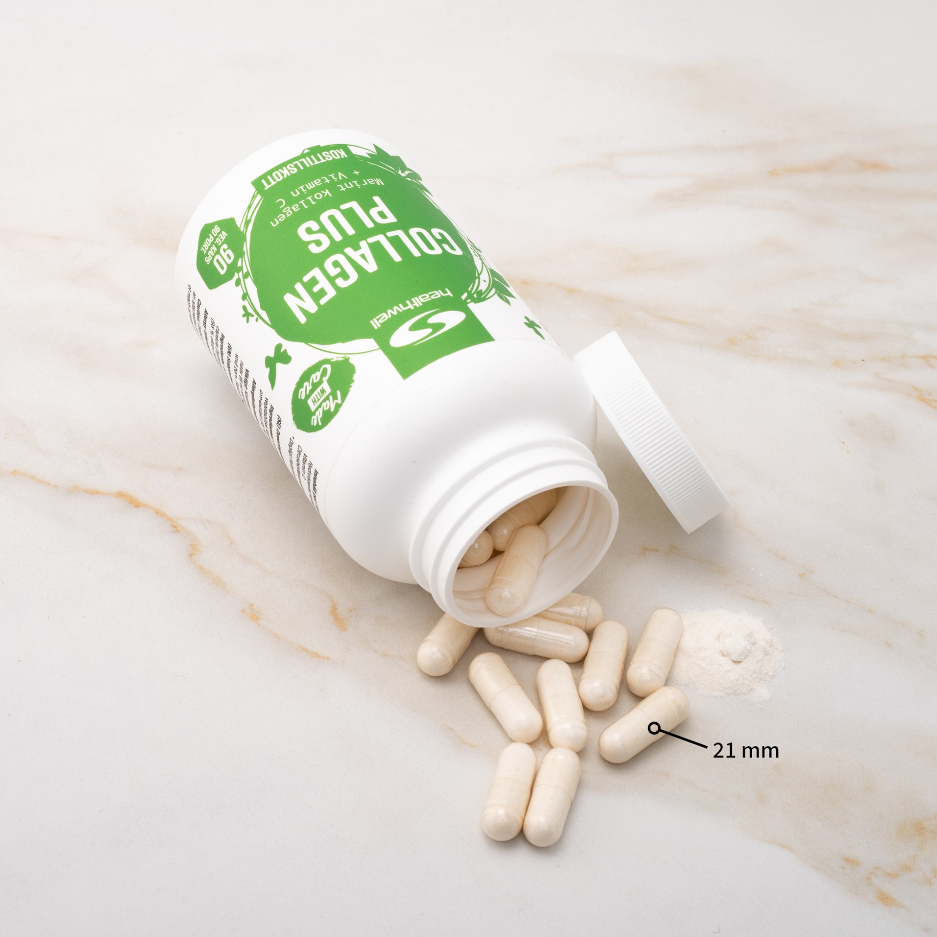 Healthwellin Collagen Plus sisältää hydrolysoitua kollageenia merellisestä lähteestä. Kalakollageeni on hyvä lähde sekä tyypin I että tyypin II kollageenille. Kalaperäisen kollageenin yhtenä etuna on sen hyvä imeytymiskyky kehoon. Ravintolisissä käytetään usein lihaa kollageenin lähteenä, mutta Collagen Plus sopii myös pescovegetaristeille, koska se on peräisin kalasta. Kollageenin molekyylipaino on 2000 daltonia, mikä tarkoittaa, että molekyylit ovat riittävän pieniä kehon käytettäviksi.