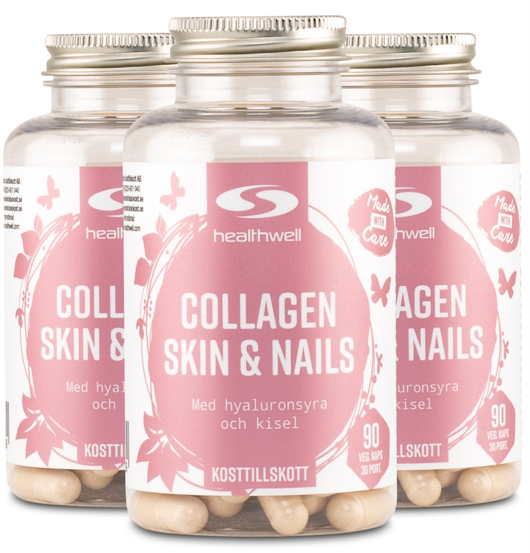 Haluatko kätevän tavan pitää hyvää huolta kynsistäsi ja ihostasi? Healthwell Collagen Skin & Nails -kapseleista saat useita ravintoaineita, jotka ylläpitävät ihon kimmoisuutta ja kynsien laatua. Kollageeni on proteiini, joka kattaa noin kolmanneksen kaikesta kehossa olevasta proteiinista ja sitä löytyy useista eri tukikudoksista, kuten ihosta, luista, jänteistä ja verisuonten seinämistä. Healthwell Collagen Skin & Nails -lisäravinne sisältää konsentroituja, tyypin I kollageenipeptidejä, joita löytyy pääasiassa hiusten, ihon, kynsien, lihasten ja luuston kudoksista. Kapseleissa on lisäksi hyaluronihappoa, C-vitamiinia, sinkkiä ja pantoteenihappoa.