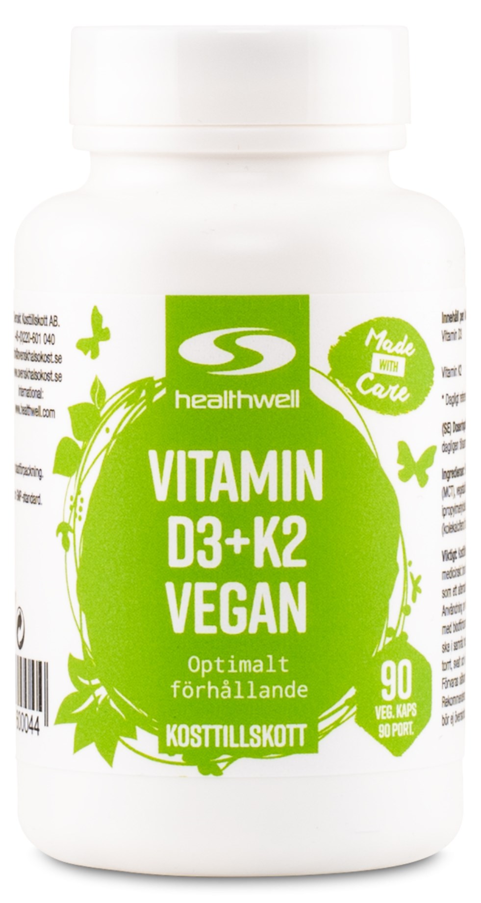 Healthwellin D3+K2 vitamiini Vegaani on hyvin tasapainotettu, vegaaninen lisäravinne, joka sisältää D- ja K-vitamiineja. Näitä vitamiineja kannattaa nauttia samanaikaisesti, sillä ne auttavat yhdessä kehoa ylläpitämään luuston rakennetta. D-vitamiini edistää myös lihasten ja immuunijärjestelmän toimintaa, kun taas K-vitamiini on tärkeä veren hyytymiselle.