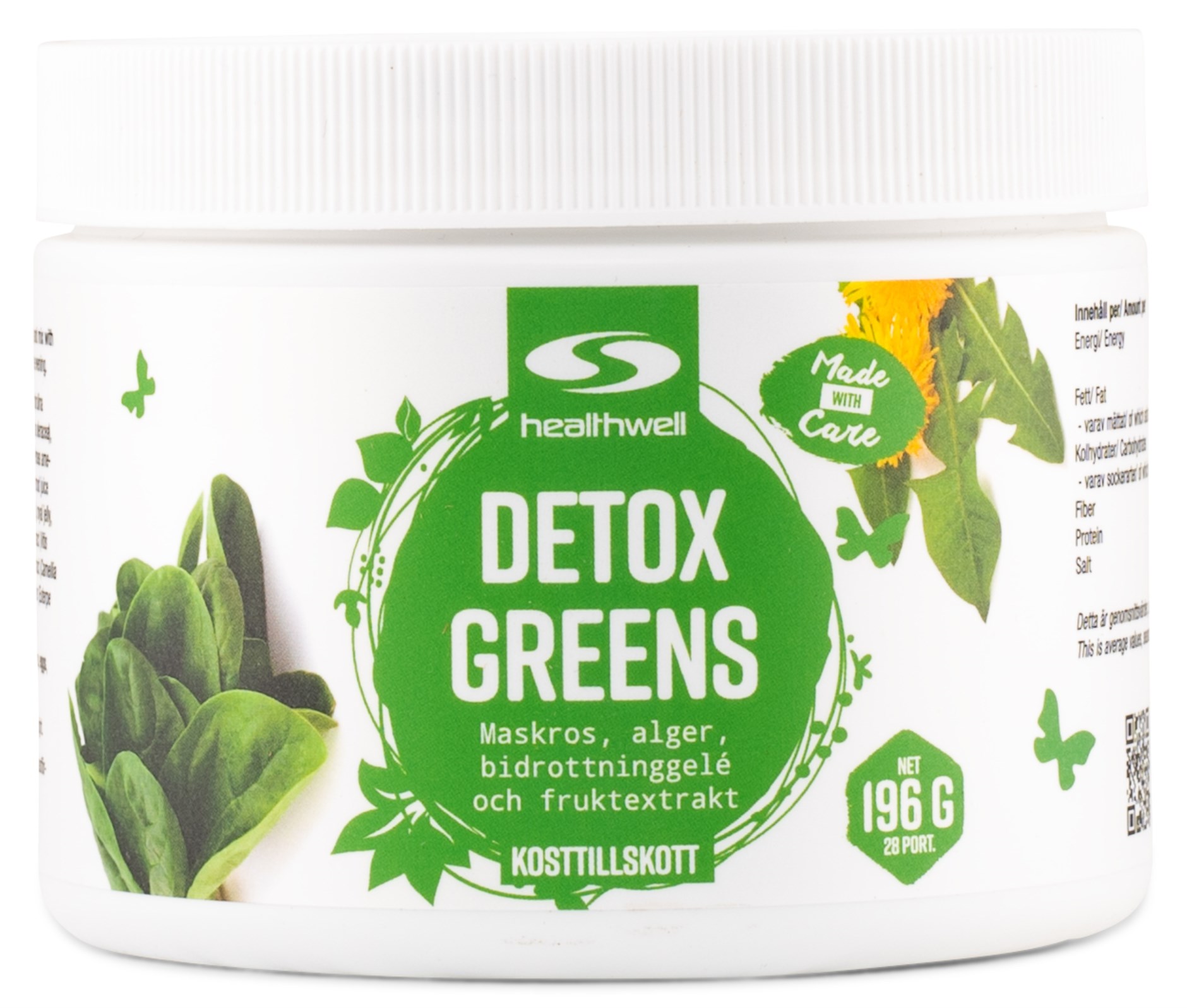 Healthwell Detox Greens on ravinteikas ja 100 % luonnollinen sekoitus vihanneksia, hedelmiä, marjoja, levää ja yrttejä. Se sopii hyvin käytettäväksi detox-kuurin yhteydessä tai osana terveellistä ruokavaliota. Healthwell Detox Greens sisältää runsaasti tärkeitä ravintoaineita ja antioksidantteja, jotta saat toteutettua mahdollisimman hyvän puhdistuskuurin. Yksi annos Healthwell Detox Greensia vastaa suurta kulhollista hedelmiä ja vihanneksia, eikä se sisällä lisäaineita, makeutusaineita tai lisättyä sokeria. Täydellinen valinta sinulle, joka haluat erityisen puhtaan tuotteen!