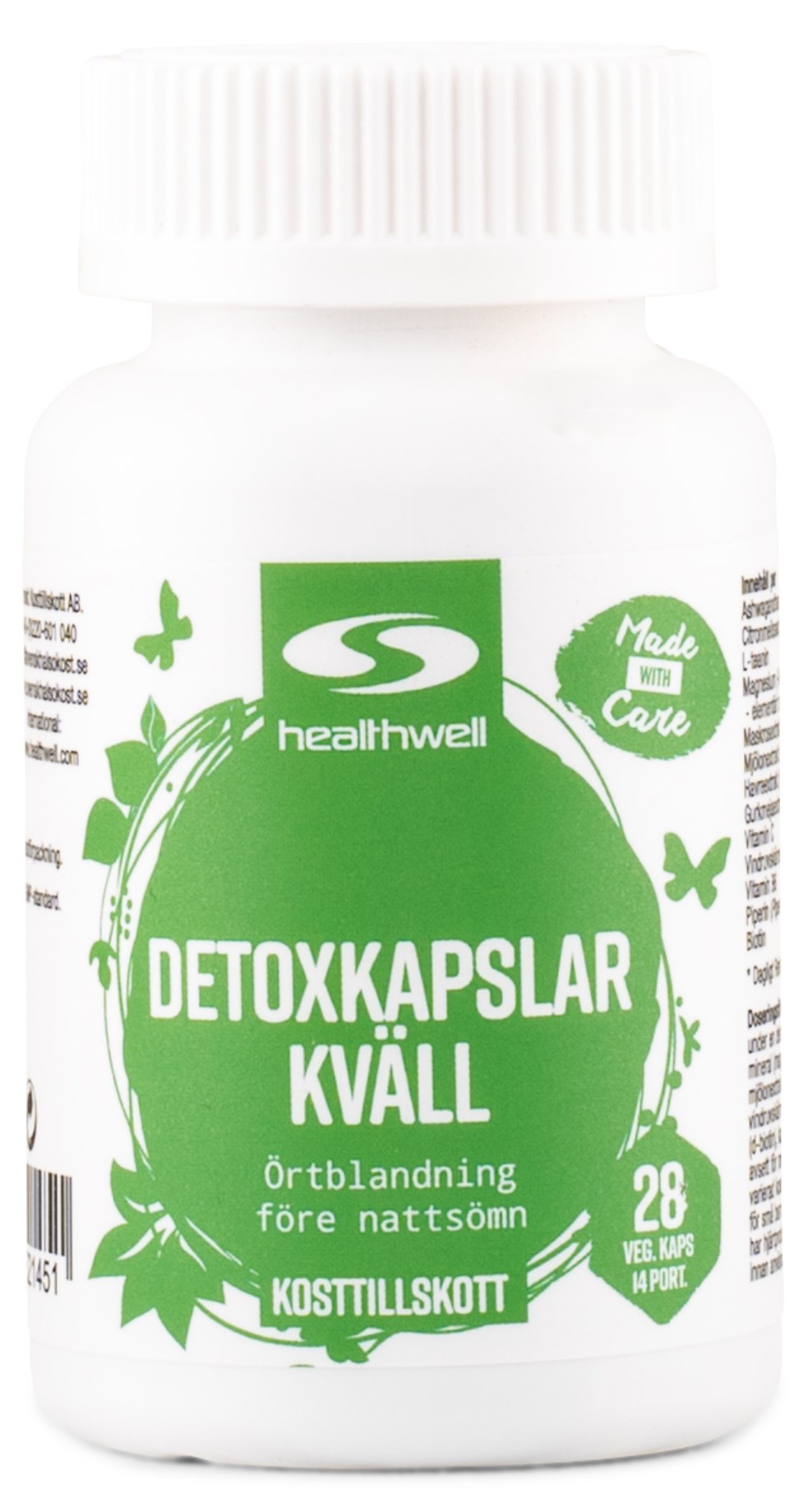 Healthwell Detox-kapselit Ilta -ravintolisä on kehitetty erityisesti auttamaan kehoa rentoutumaan ja rauhoittumaan iltaisin. Ravintolisä sisältää muun muassa sitruunamelissaa, ashwagandhaa ja L-teaniinia. Sen ainutlaatuinen koostumus sisältää myös antioksidanttina toimivaa C-vitamiinia, lihasten rentoutumiskykyä tukevaa magnesiumia sekä aineenvaihduntaa ja hermoston normaalia toimintaa tukevia biotiinia ja B6-vitamiinia. Detox-kapselit Ilta -ravintolisään on lisätty piperiiniä (mustapippuriuutetta), joka parantaa ravintoaineiden imeytymistä.