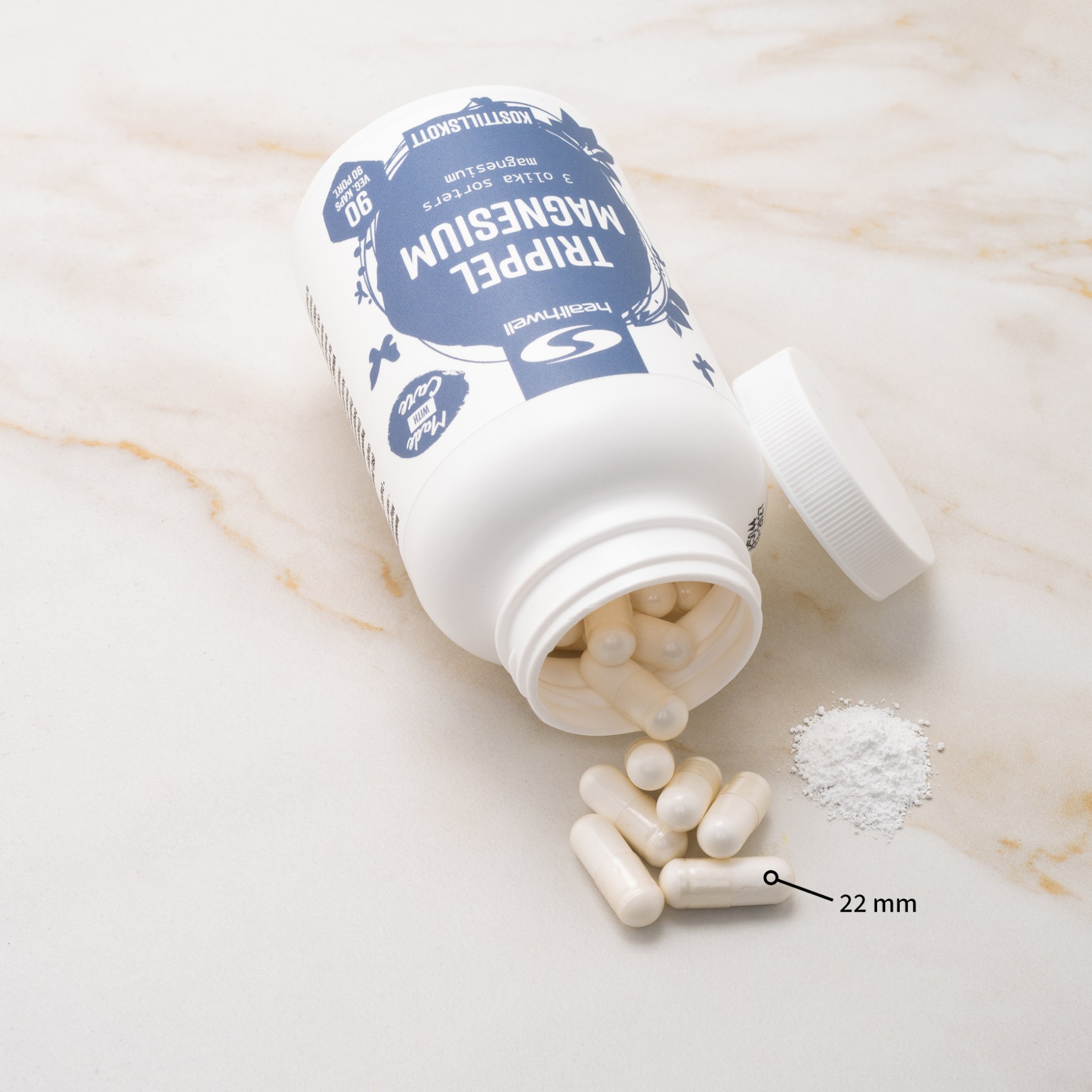 Healthwell Kolmoismagnesium sisältää kolmea erilaista magnesium-mineraalia, mikä tarjoaa keholle erinomaisen mahdollisuuden hyödyntää magnesiumia samalla kun vähennät riskiä, että esimerkiksi vatsa reagoisi negatiivisesti suurempiin määriin magnesiumia.