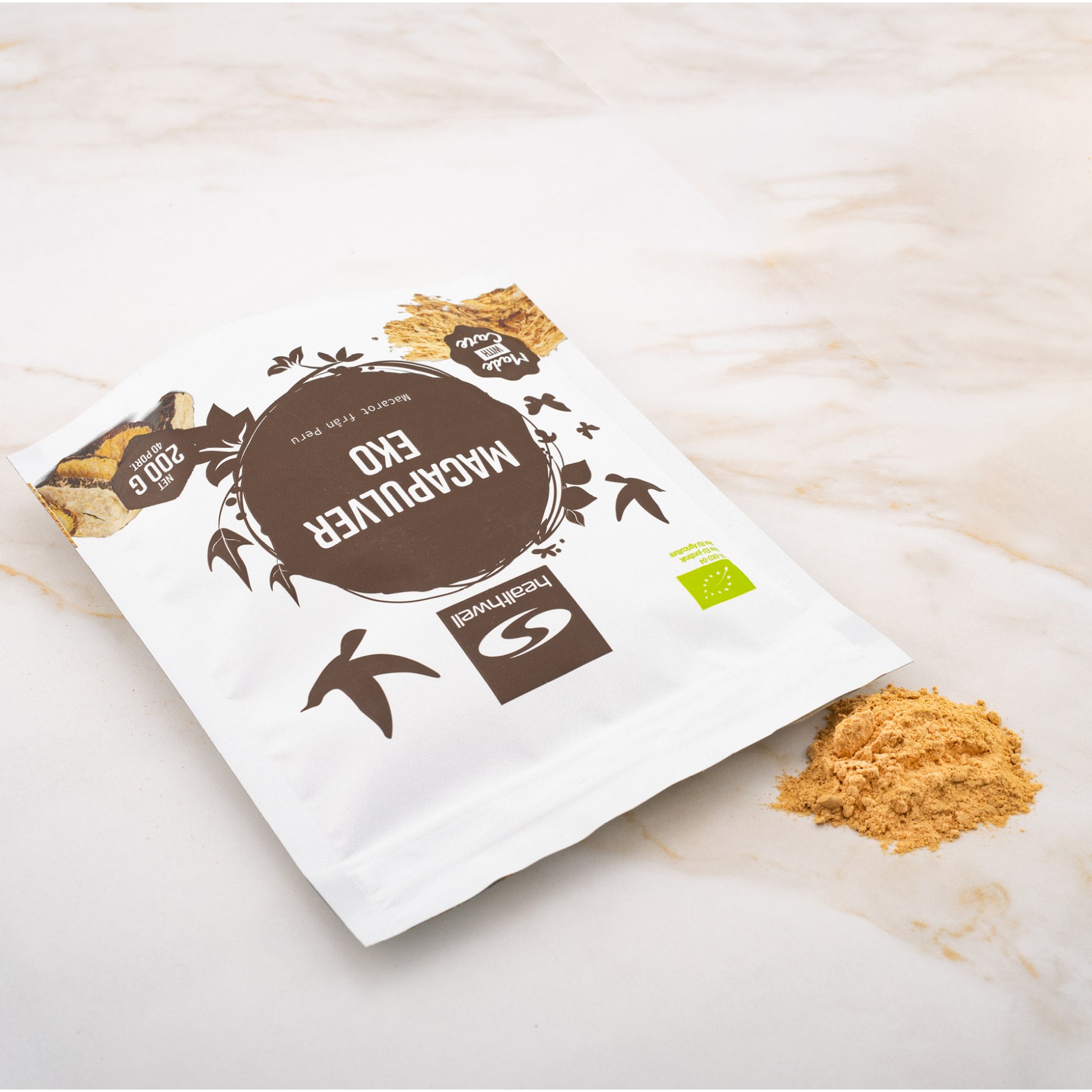 Healthwell Macajauhe, Luomu on puhdasta ja luomulaatuista macajauhetta, joka on valmistettu aidoista macajuurista. Macajuurikas kasvaa Perussa, jota usein kutsutaankin "macajuuren synnyinmaaksi". Macan on havaittu olevan virkistävää ja antavan energiaa, minkä vuoksi sitä käytetään usein energia-smoothieissa, mutta jauhe soveltuu erinomaisesti sekoitettavaksi mihin tahansa nesteeseen, kuten veteen tai maitoon. Macajuuren makua pidetään usein piparjuurta ja palsternakkaa muistuttavana. Healthwell Macajauhe, Luomu on luomuviljeltyä ja täysin vegaanista, ja se sopii sinulle, joka haluat käyttää luonnollista, energisoivaa juomaa arjessa.