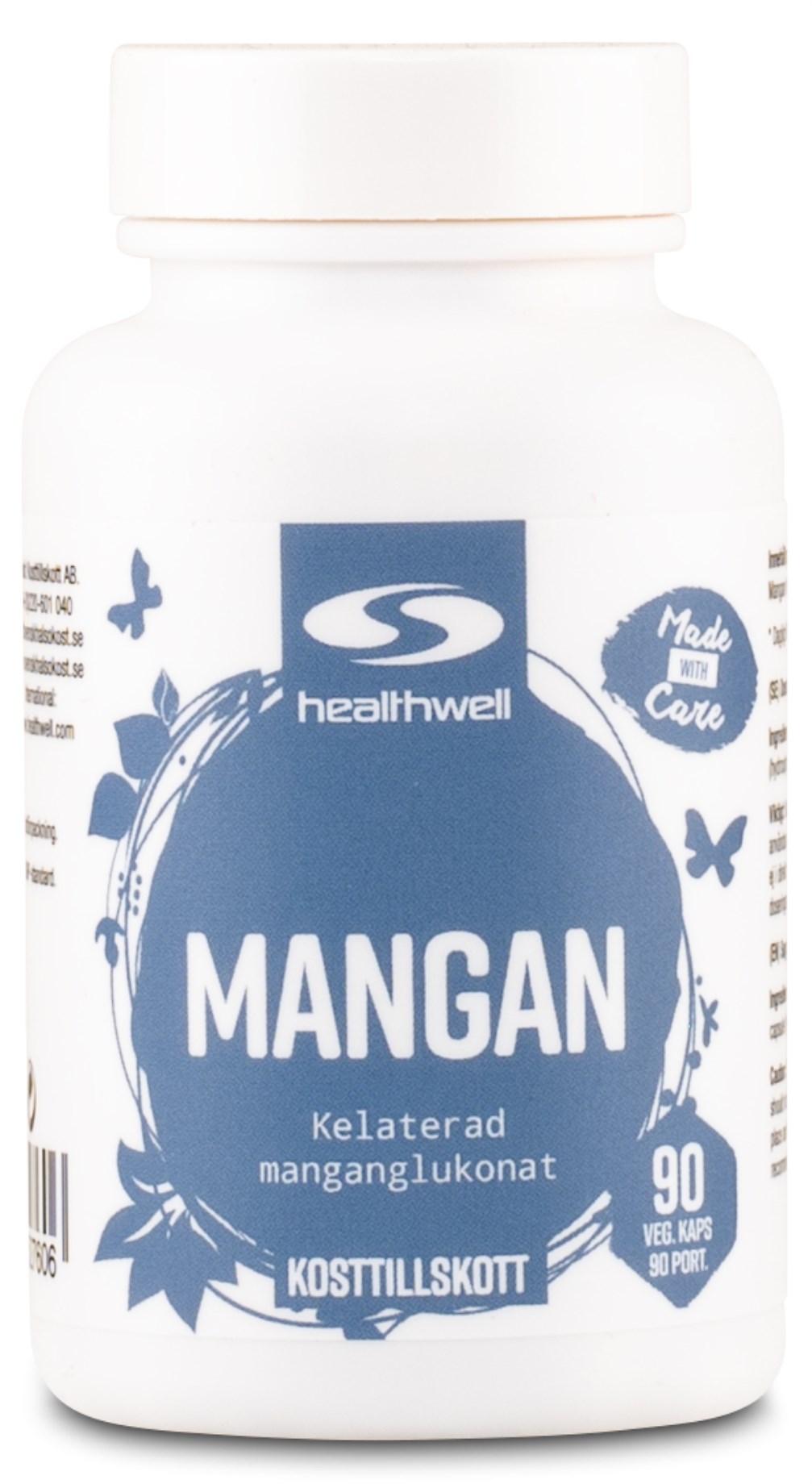 Healthwell Mangaani sisältää kelatoitua mangaaniglukonaattia. Tämä on hyödyllinen muoto, jonka keho imeyttää helposti. Mangaani on elintärkeä hivenaine, joka muun muassa auttaa ylläpitämään normaalia luustoa, normaalin sidekudoksen muodostumista sekä suojaamaan soluja oksidatiiviselta stressiltä. Healthwell Mangaani sisältää 5 mg mangaania per kapseli ja suositeltu annos on 1-2 kapselia päivässä.