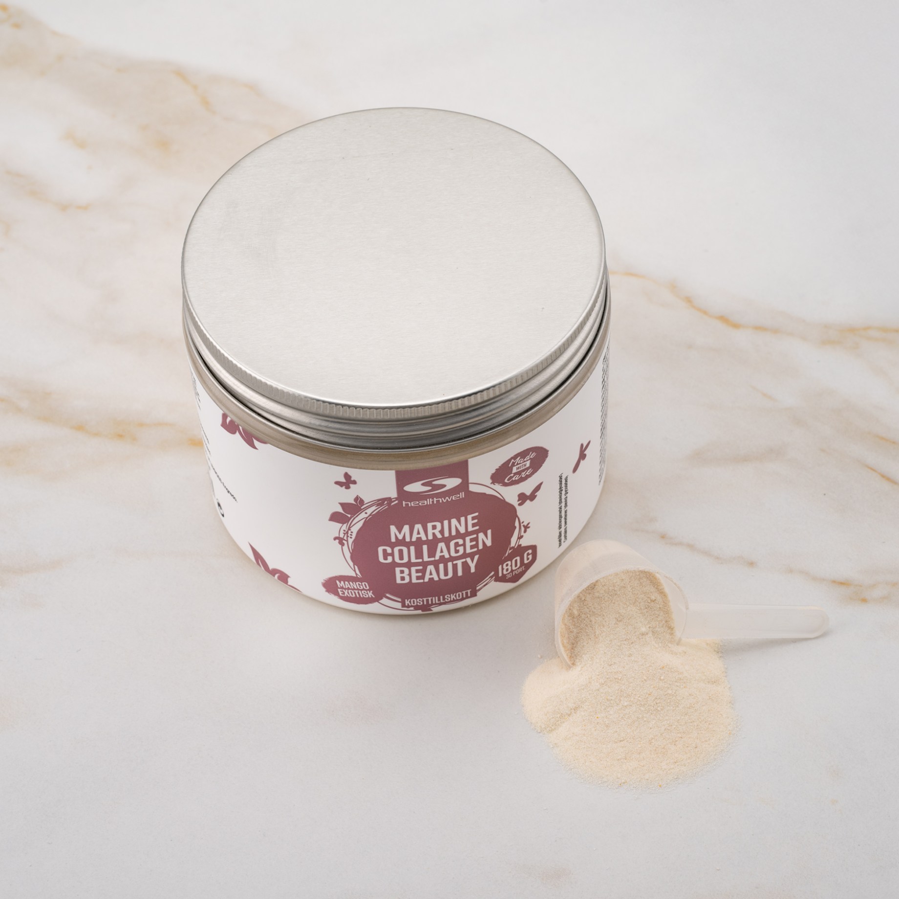 Healthwell Marine Collagen Beauty sisältää merellistä kollageenia antamaan tehoa hiuksille, iholle ja kynsille. Tutkimuksissa on osoitettu, että merellinen kollageeni on hyödyllinen kollageenimuoto iholle (1,2). Merellisessä kollageenissa on nimittäin suurempi osuus tyypin 1 kollageenia kuin naudan kollageenissa, ja tämä kollageenityyppi suositellaan usein tukemaan hiusten, ihon ja kynsien rakentumista. Lisäksi Marine Collagen Beautyn merellinen kollageeni on hydrolysoitu, jotta se imeytyisi helposti kehoosi.