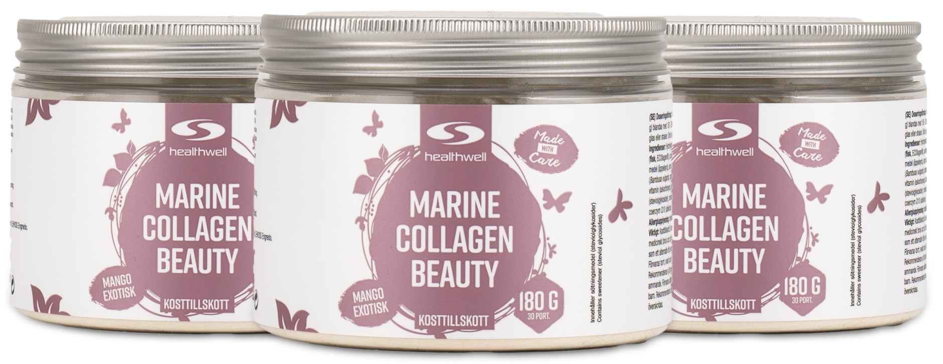 Healthwell Marine Collagen Beauty on maukas lisäravinne, joka sisältää kollageenia merellisistä lähteistä, sekä useita hyödyllisiä ainesosia, jotka tukevat hiuksia, ihoa ja kynsiä sisältäpäin. Hyaluronihappo sitoo kosteutta samalla kun antioksidantti C-vitamiini suojaa ihoa vapailta radikaaleilta. Lisäravinne on helppo sekoittaa nesteeseen ja se liukenee nopeasti. Käytä sekoitukseen lusikkaa tai shakeria. Eksoottisen mangon hyvä maku peittää kalamaun ja vie ajatukset trooppiselle rannalle. Lisäravinne on makeutettu steviolglykosideilla terveelliseksi kokemukseksi.