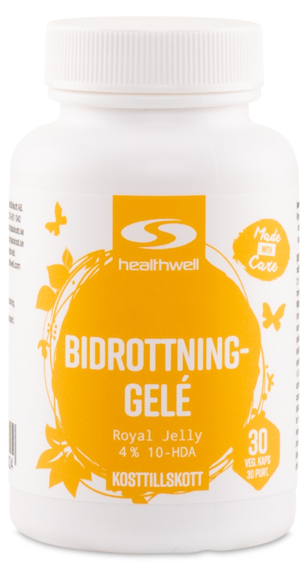 Healthwell Mehiläiskuningatargeeli Royal Jelly sisältää luonnollista uutetta mehiläiskuningatargeelista, mielenkiintoisesta ainesosasta, joka on peräisin mehiläispesistä. Tuote sisältää 4 % ainesosaa 10-DHA, jota pidetään aktiivisena ainesosana. Mehiläiskuningatargeeliä on tutkittu mm. sen vaikutuksen osalta hormonitasapainoon vaihdevuosien ja PMS:n aikana, hedelmällisyyteen sekä hiusten, ihon ja kynsien laatuun. Suositeltu annostus on 1-2 kapselia päivässä.