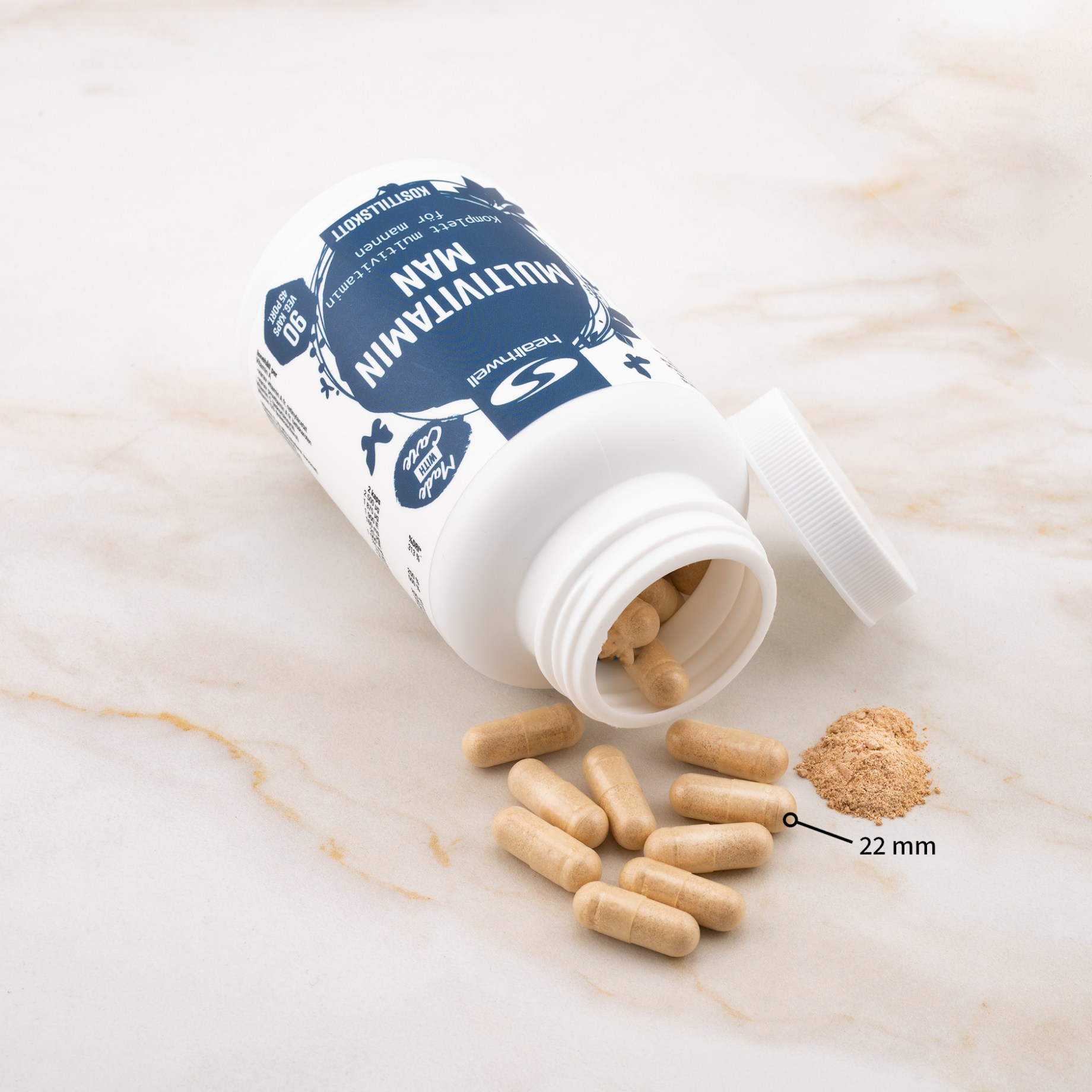 Monivitamiini Mies on täydellinen monivitamiini- ja mineraalilisä, joka on erityisesti suunniteltu miesten tarpeisiin, sisältäen yrtti-, vihannes- ja hedelmäyhdisteitä. Kaksi kapselia päivässä tätä monivitamiinia antaa sinulle tärkeimpien vitamiinien ja mineraalien suositellun päivittäisen saannin, mikä tukee terveellisempää elämäntyyliä. Healthwell Monivitamiini Mies sisältää muun muassa D3-vitamiinia, jota saamme yleensä auringonvalosta ja joka on tärkeä tekijä solujen kasvulle ja hermoston normaalille toiminnalle.