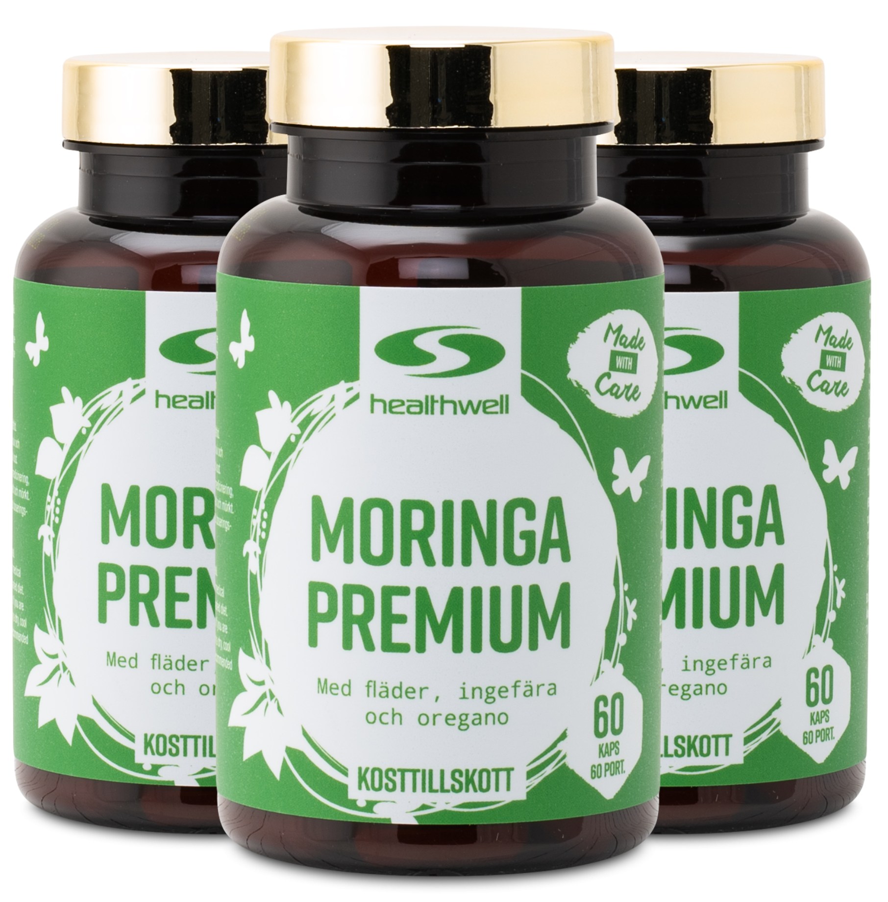 Healthwell Moringa Premium on erittäin suuriannoksinen lisäravinne, joka sisältää korkealaatuista moringaa. Yksi kapseli vastaa peräti 5 grammaa moringajauhetta, mikä antaa sinulle erinomainen määrän moringaa jokaisella annoksella. Moringauute on standardoitu 5 % kversetiinille – mielenkiintoiselle aineelle, joka voi auttaa kehoa imeyttämään sinkkiä tehokkaammin. Tavanomaisen ravinnebuustin lisäksi sisältää myös oreganon, seljanmarjan ja inkiväärin uutteita – tunnettuja yrttejä, joita käytetään usein kotikonsteissa ja joiden mahdollisia vaikutuksia immuunijärjestelmään tutkitaan. Jotta voisit hyödyntää Healthwell Moringa Premium -tuotteen ravinteikkaan sisällön, kapseleihin on lisätty mustapippuriuutetta, joka parantaa ainesosien biologista hyötyosuutta.