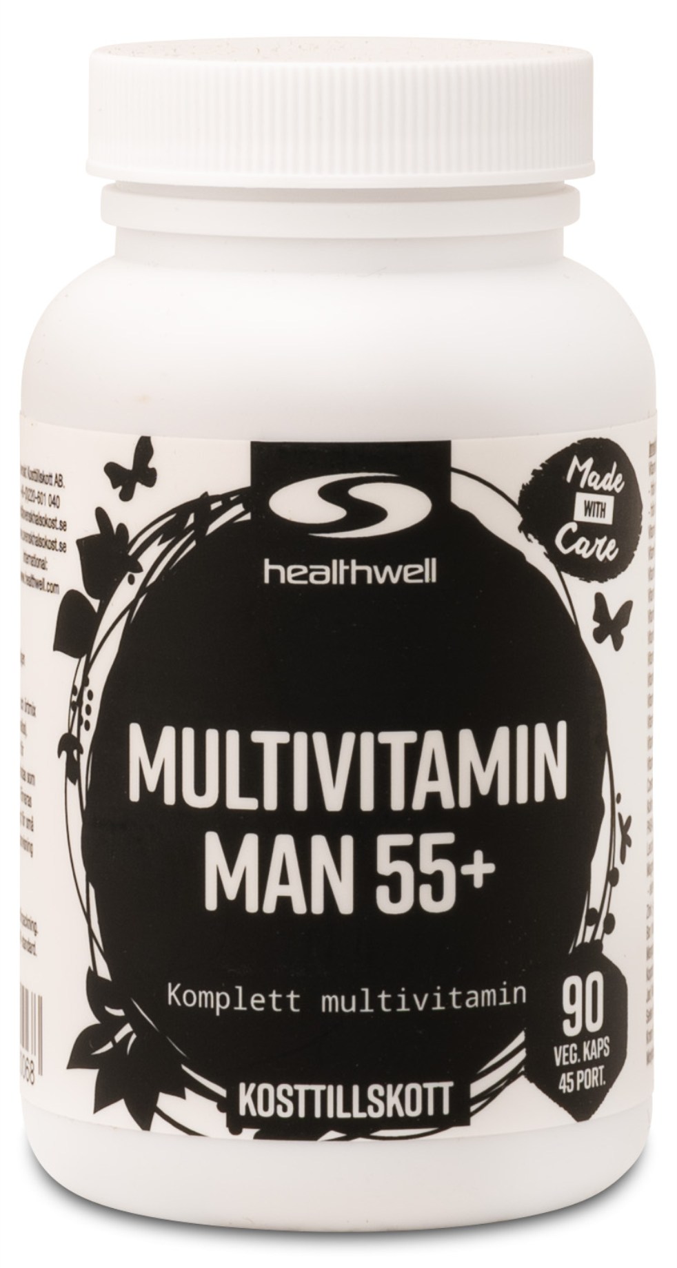 Healthwell Multivitamin Man 55+ on huolellisesti suunniteltu yli 55-vuotiaille miehille. Mukana ovat kaikki tärkeät vitamiinit ja mineraalit, joita keho tarvitsee toimiakseen optimaalisesti. Mukana on muun muassa magnesiumia 160 mg vuorokausiannoksessa, mineraalia, joka edistää lihasten ja hermoston toimintaa. Sinkki -mineraalia on mukana 25 mg annosta kohti, joka on erityisen mielenkiintoinen miehille kaikissa ikäryhmissä. Sinkki edistää muun muassa valkuaisaineiden ja DNA:n synteesiä, normaalia lisääntymiskykyä sekä normaalin hiusten ylläpitämistä.
