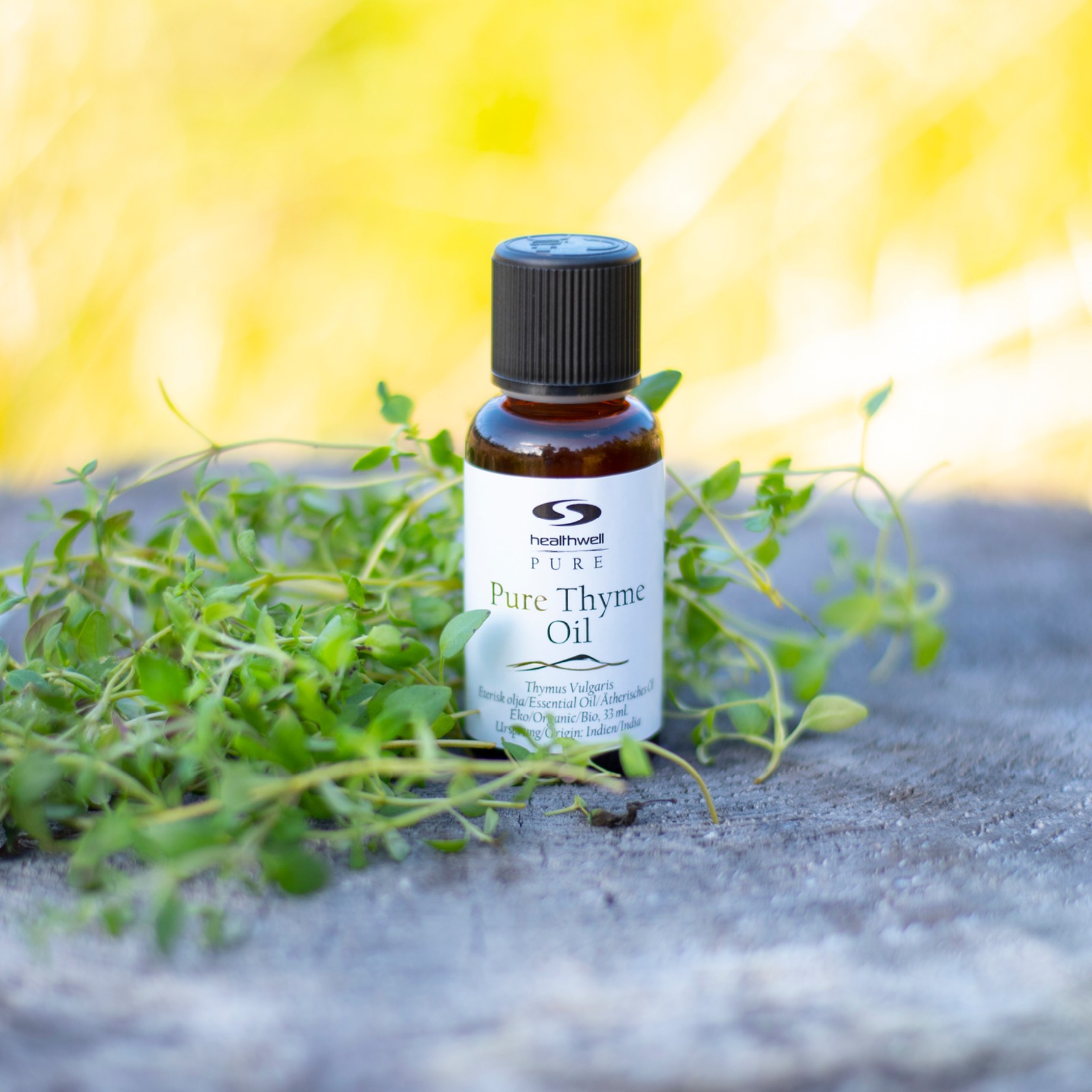 Healthwell PURE Timjamiöljy EKO on eteerinen öljy, joka sisältää 100 % puhdasta maustetimjamista saatua öljyä. Timjamiöljy on monikäyttöinen ja sopii moneen. PURE Timjamiöljy EKO on erittäin konsentroitu ja sisältää pelkkää puhdasta öljyä, minkä ansiosta se on riittoisa - annostelussa riittää yksi tai kaksi tippaa. Timjamiöljyllä on yrttinen timjamin tuoksu, ja se sopii hyvin muun muassa ihonhoitoon, sillä timjamilla on antiseptisiä ominaisuuksia. Öljy toimii erinomaisesti myös aromaterapiassa, sillä se virkistää ja puhdistaa huoneilmaa.