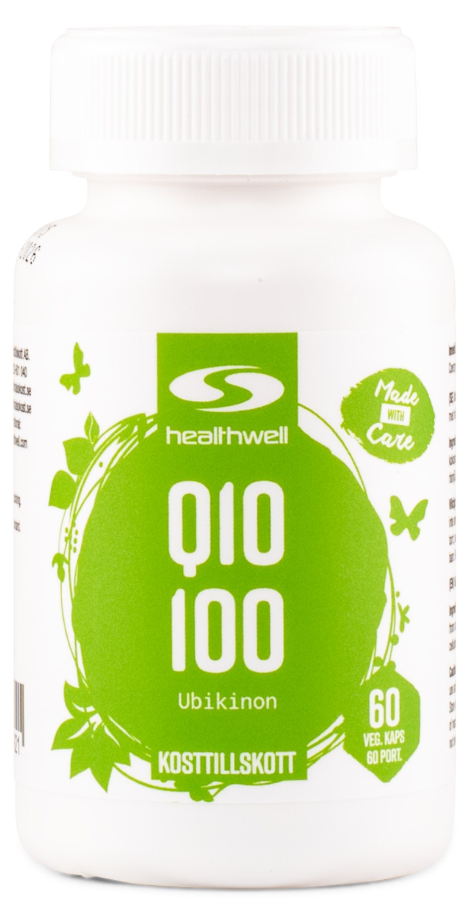 Healthwell Q10 100 sisältää 100 mg puhdasta koentsyymi Q10:tä kapselia kohti, ubikinonimuodossa, joka vastaa kehon omaa Q10:n tuotantoa. Tätä ainetta löytyy luonnollisesti sydämestä ja aivoista, joissa se toimii antioksidanttina ja suojaa soluja. Q10:n tasot kehossa laskevat iän myötä, noin 30 ikävuodesta alkaen. Healthwell Q10 100 on hyvä valinta niille, jotka haluavat varmistaa Q10:n saannin. Suositeltu annostus on 1 kapseli päivässä.