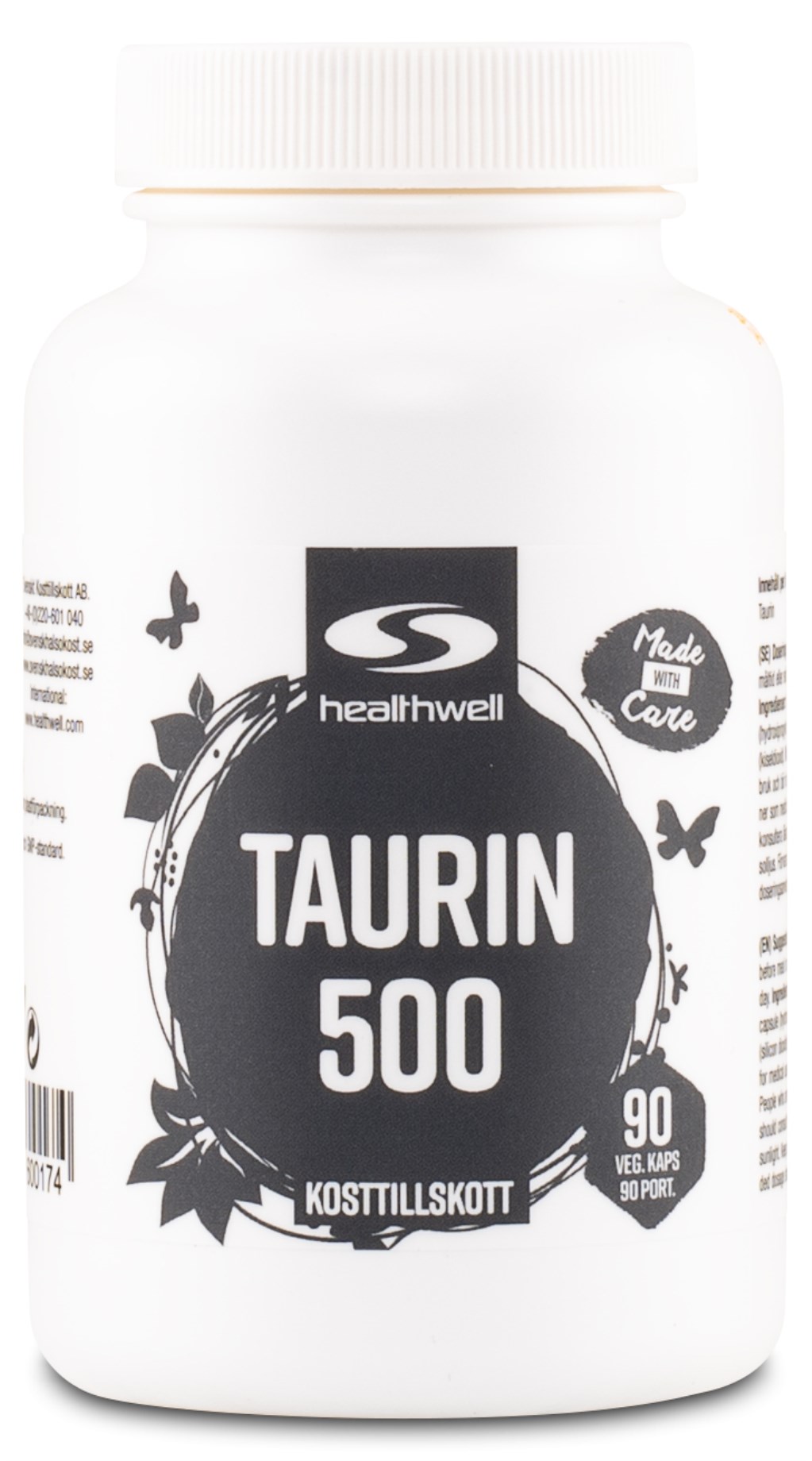 Healthwell Tauriini 500 on tauriinia sisältävä lisäravinne, joka tarjoaa 500 mg tauriinia jokaisessa kapselissa. Tauriini on semi-essentiaalinen aminohappo, mikä tarkoittaa, että keho tuottaa sitä jonkin verran. Tauriinia saadaan ravinnosta etupäässä eläinperäisistä elintarvikkeista. Tauriini on yleisimmin esiintyvä aminohappo sydämessä, ja se auttaa muun muassa säätelemään sydämen sykettä. Aminohappo on myös välttämätön sappisuolojen rakentamiselle, jotka ovat tärkeitä normaalin rasvan imeytymisen ja rasvaliukoisten vitamiinien imeytymisen kannalta. Lisäravinne on täysin vegaaninen.