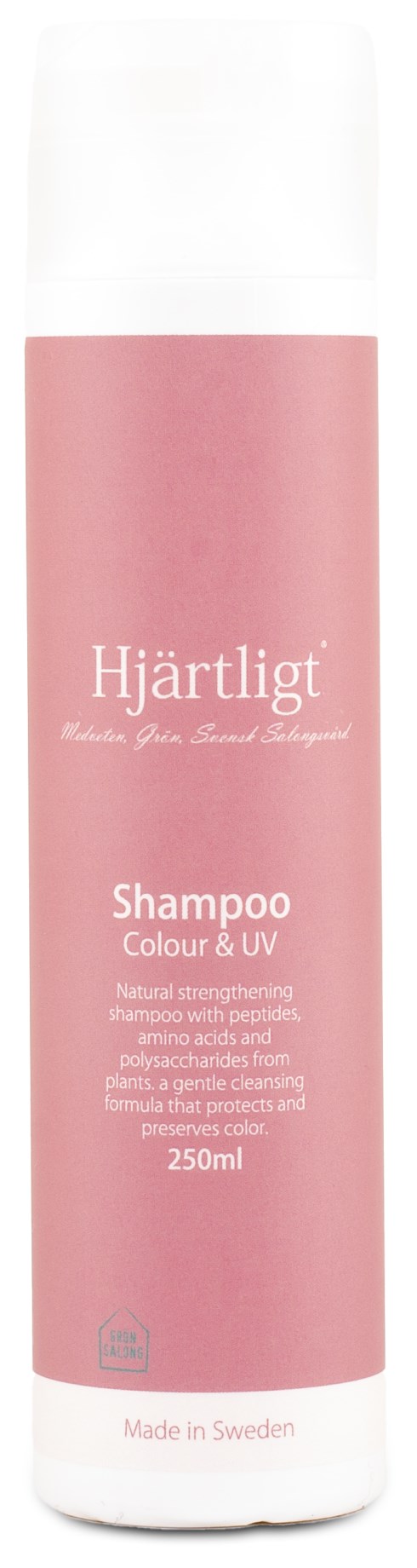 Hjärtligt Väri & UV Shampoo on ekologinen värishampoo, jossa on UV-suoja. Se auttaa säilyttämään hiusvärin ja estää hiuksia menettämästä kiiltoa ja kirkkautta. Erityinen keratiinin ja riisiproteiinin sekoitus suojaa sekä luonnollista että värikäsiteltyä hiusväriä. Kun hiukset altistuvat auringonvalolle, niiden proteiinit ja lipidit voivat hapettua, mikä johtaa voiman, kiillon ja värin menetykseen. Erityisesti hiusten pintakerros (kutikula) altistuu auringonvalolle, mikä voi aiheuttaa heikkoutta ja vaurioita hiuksissa. Hiukset voivat tällöin muuttua pörröisiksi, elottomiksi ja menettää värinsä ja kiiltonsa. Hjärtligt Väri & UV Shampoo sisältää runsaasti antioksidantteja ainesosista, kuten kylmäpuristetusta rapsiöljystä ja auringonkukkaöljystä, jotka ovat E-vitamiinirikkaita.