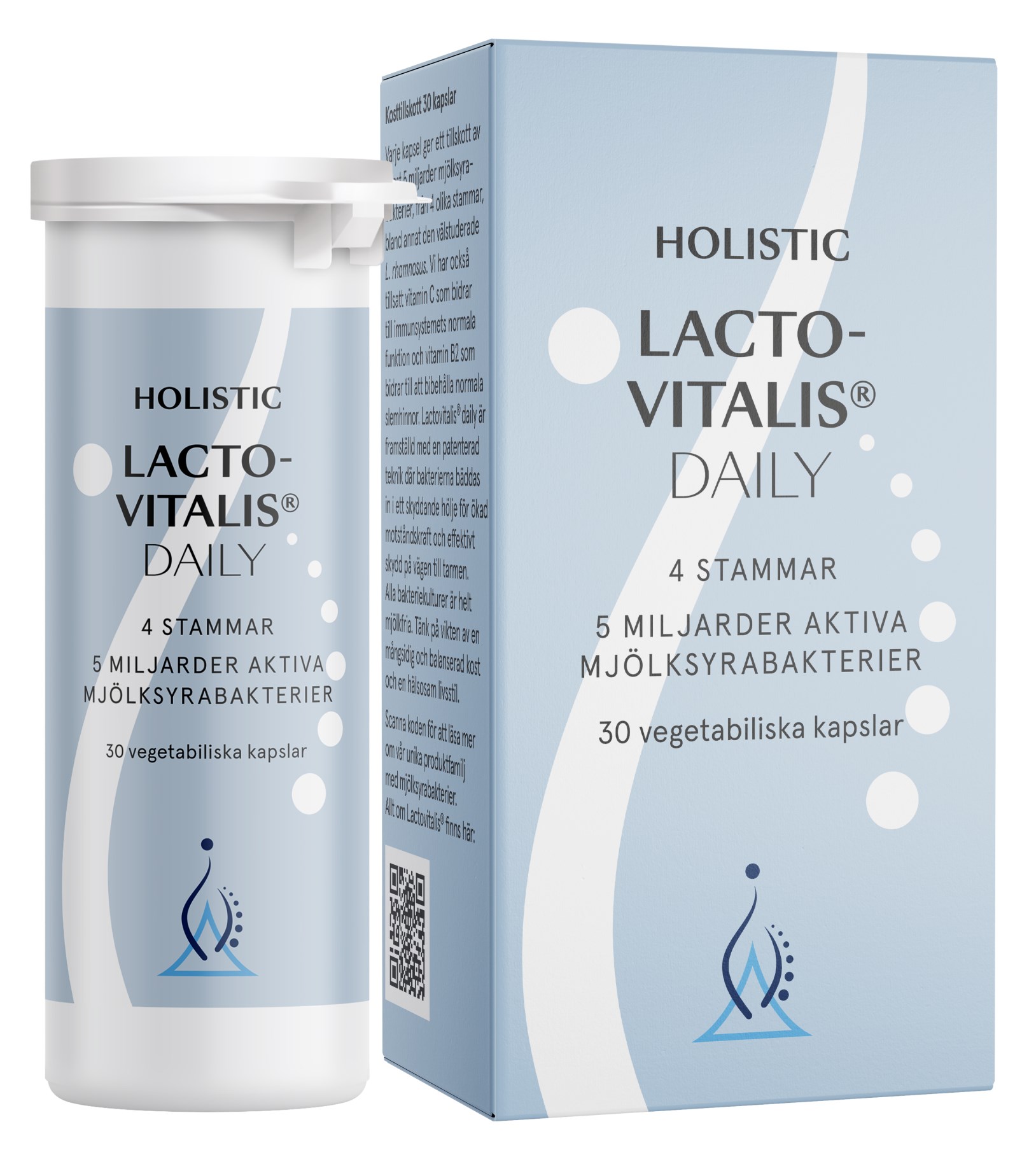 Lactovitalis Daily Holisticilta on lisäravinne, joka sisältää maitohappobakteereita neljästä erilaisesta hyvin tutkitusta bakteerikannasta, vähintään viisi miljardia bakteeria per kapseli. Jokaisella akteerikannalla on omat ainutlaatuiset ominaisuutensa, jotka täydentävät toisiaan edistäen tervettä ja tasapainoista suolistoflooraa. Lactovitalis Daily sisältää myös FOS:ia (frukto-oligosakkarideja), joka on eräänlainen ravintokuitu ja varmistaa suotuisan ympäristön hyvien bakteerien kasvulle ja aktiivisuudelle suolistossa. Lisäksi Lactovitalis Daily on rikastettu C-vitamiinilla ja B12-vitamiinilla, jotka edistävät immuunijärjestelmän normaalia toimintaa ja ylläpitävät normaaleja limakalvoja. Sopii myös vegaaneille!