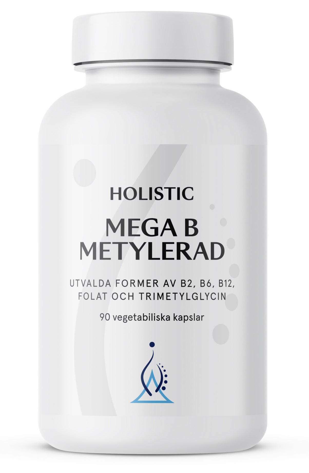 Holistic Metyloitu Mega B- vitamiini on ravintolisä, joka sisältää kaikkia B-vitamiinin muotoja. Valmiste sisältää erityisesti valittuja muotoja B6-, B12- ja foolihaposta, nämä kolme edistävät immuunijärjestelmän normaalia toimintaa, vähentävät väsymystä ja uupumusta. B1, B2 ja B3 edistävät normaalia energia-aineenvaihduntaa ja hermoston normaalia toimintaa. Holistic Metyloitu Mega B-vitamiini sisältää myös metyylilahjoittajan betaiinia, inositolia, PABA:a ja koliinia, nämä edistävät normaalia rasva-aineenvaihduntaa ja maksan toiminnan ylläpitoa. B-vitamiini on erittäin hyvä lisä sinulle, joka olet erittäin aktiivinen tai korkean aineenvaihdunnan vuoksi jostain muusta syystä, jotta varmistetaan B-vitamiinien saanti. B-vitamiinit ovat vesiliukoisia eivätkä varastoidu kehossa, siksi meidän on täydennettävä niitä ruokavalion kautta.