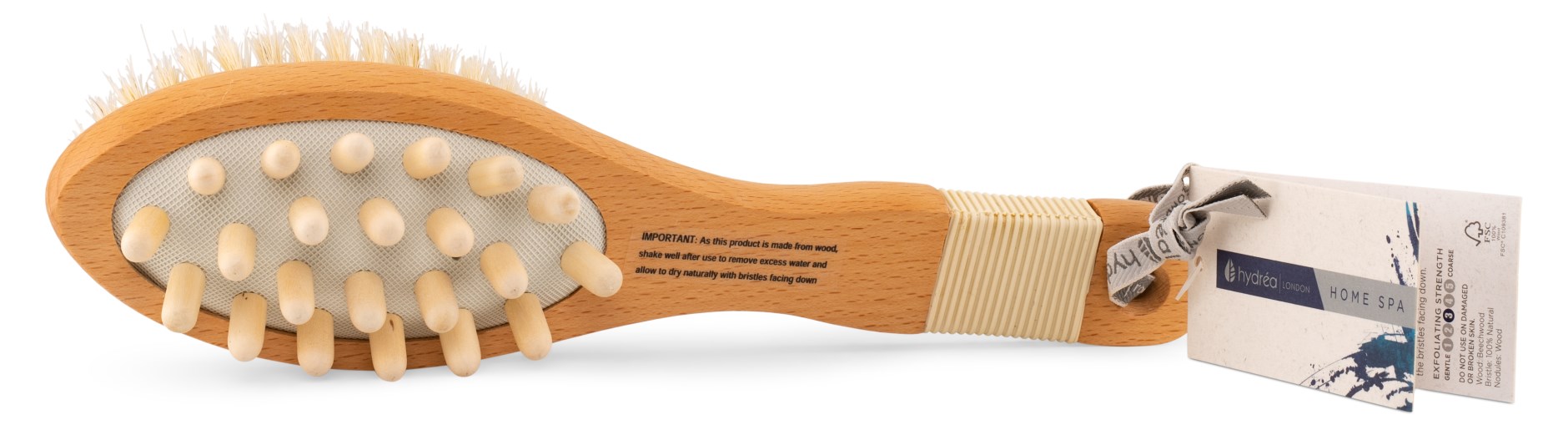 Tutustu Hydréa London Dual Use Massage -puuhierontaharjaan, monipuoliseen harjaan, joka on täydellinen sekä vartalohierontaan että kuivaharjaukseen. Tässä harjassa on kaksi hyödyllistä puolta joilla voi hoitaa vartaloa eri tavoin. Toinen puoli, jossa on puunuppeja, on ihanteellinen hieronta- ja kehonjännitysten lievittämiseen. Toisella puolella taas on luonnonharjassivu, joka kuorii ihosi ja lisää verenkiertoa rentouttavaa kokemusta varten. Tämä on erittäin hyvä hierontaharja, kun haluat antaa kehollesi lisähoitoa. Harja on FSC®-sertifioitua pyökkipuuta.