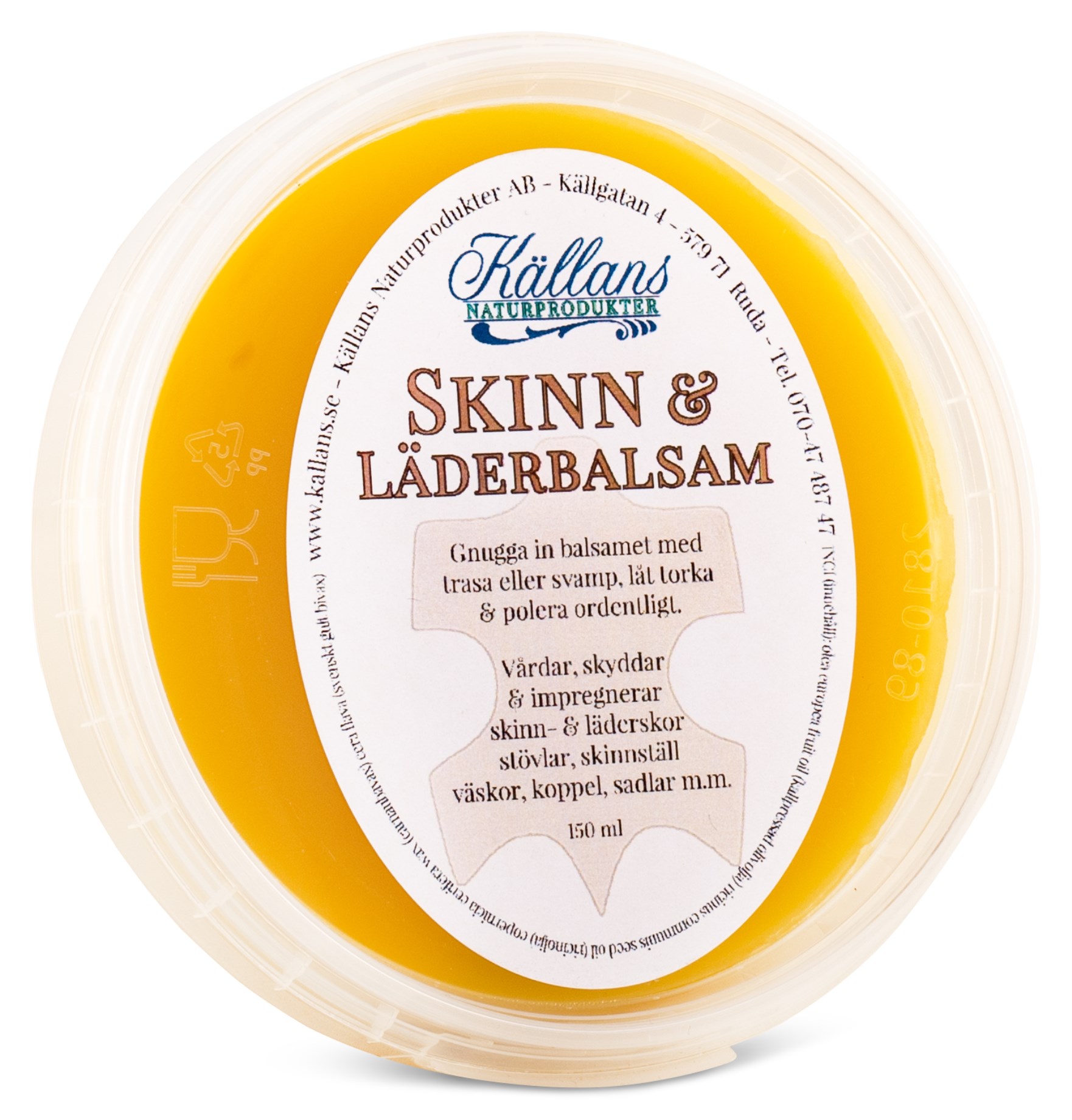 Källans Naturprodukter Skin & Leather Balsam on luonnollinen hoitoaine, joka pehmentää, tiivistää ja suojaa nahkaa. Erinomainen käytettäväksi nahkasohvalla, laukkuissa, koirientalutushihnoissa, satuloissa ja kengissä jne. Källans Skin & Leather Balsam on valmistettu kasviperäisistä ainesosista sekä ruotsalaisesta mehiläisvahasta. 100 % luonnollinen, ympäristöystävällinen ja paikallisesti tuotettu!