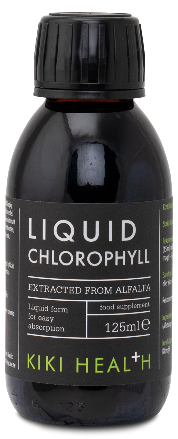 Kiki Health Liquid Chlorophyll on nestemäinen klorofyllilisä, joka on uutettu sinimailasesta. Klorofylli on aine, joka värjää kasvit vihreiksi ja toimii kasvien hemoglobiinin tavoin. Se on runsas antioksidanttien lähde. Kiki Health Liquid Chlorophyll on täysin luonnollinen ja kasviperäinen, ja siinä on luonnollinen maku.