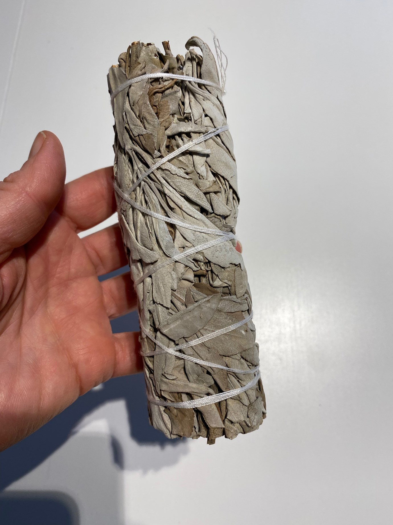 Kristallpunkten Valkoinen Salvia nippu on valmiiksi sidottu nippu valkoista salviaa (Salvia apiana), jota käytät savustamisrituaaleihin. Salvia on yksi yleisimmin käytetyistä kasveista rituaaleissa ja meditaatiossa. Sytytä salvia-nippu toisesta päädystä, anna palaa hetken ja sammuta liekki. Anna savun levitä huoneeseen. Monet käyttävät sitä vapauttamaan seisovan energian huoneesta tai itsestään tai kristallien puhdistamiseen. Kaksi kokoa: Keski (35-40 g) ja Suuri (90-100 g).
