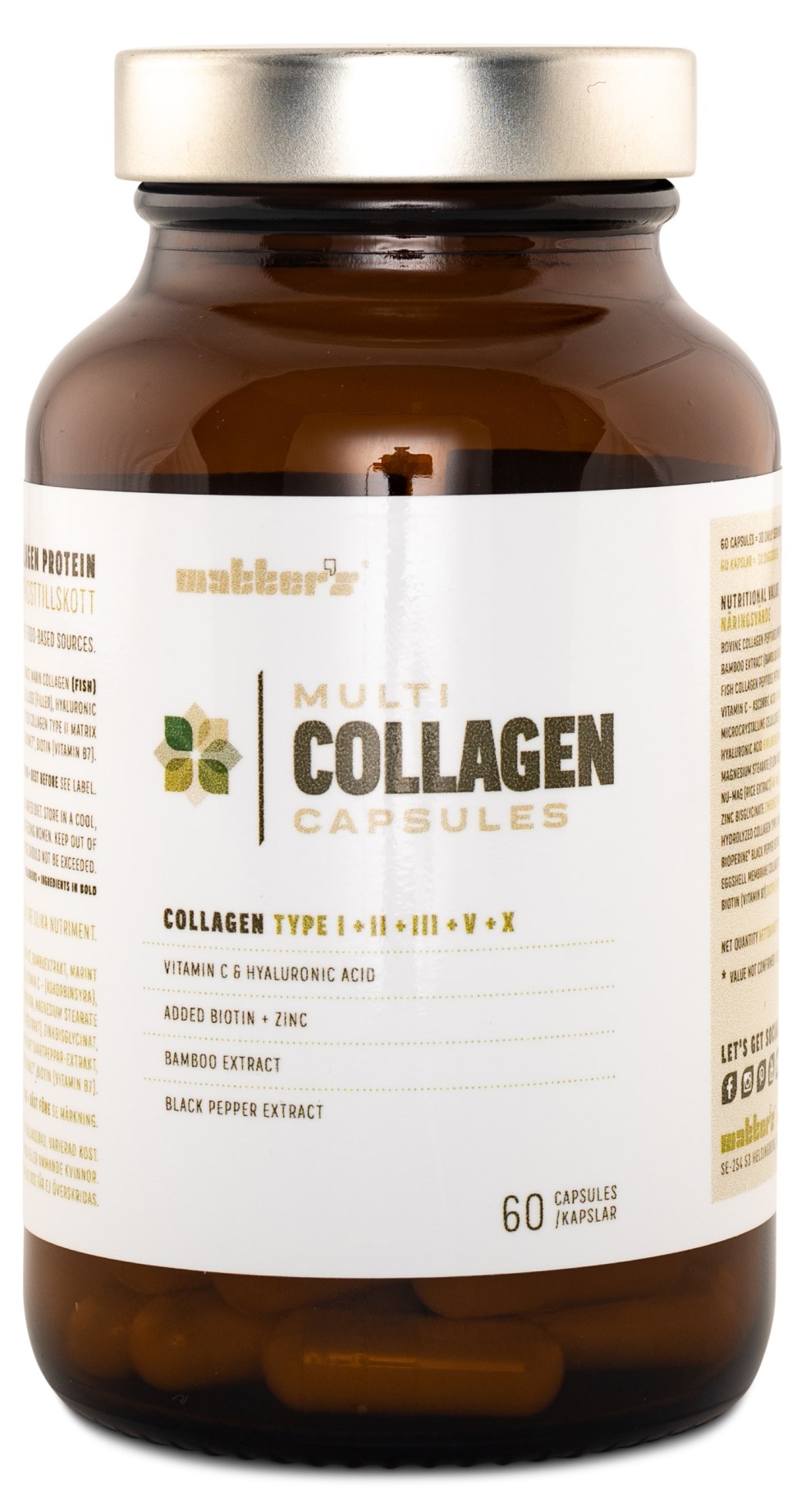Matters Multi Collagen Capsules sopii sinulle, joka haluat ottaa kollageenisi helposti mukaan matkoille tai liikkeellä ollessasi. Kollageeni on kätevästi kapseleissa, purkissa, jonka voit ottaa mukaan minne tahansa. Matters Multi Collagen Capsules sisältää viittä eri tyyppiä kollageenia kolmesta eri raaka-aineesta; naudasta, kalasta ja munasta. Lisäksi täydennys sisältää myös kollageenia tukevia aineita, kuten C-vitamiinia, hyaluronihappoa, biotiinia, sinkkiä ja bambu-uutetta optimaalisen vaikutuksen saavuttamiseksi.
